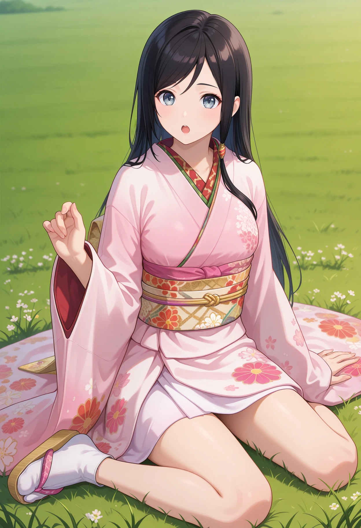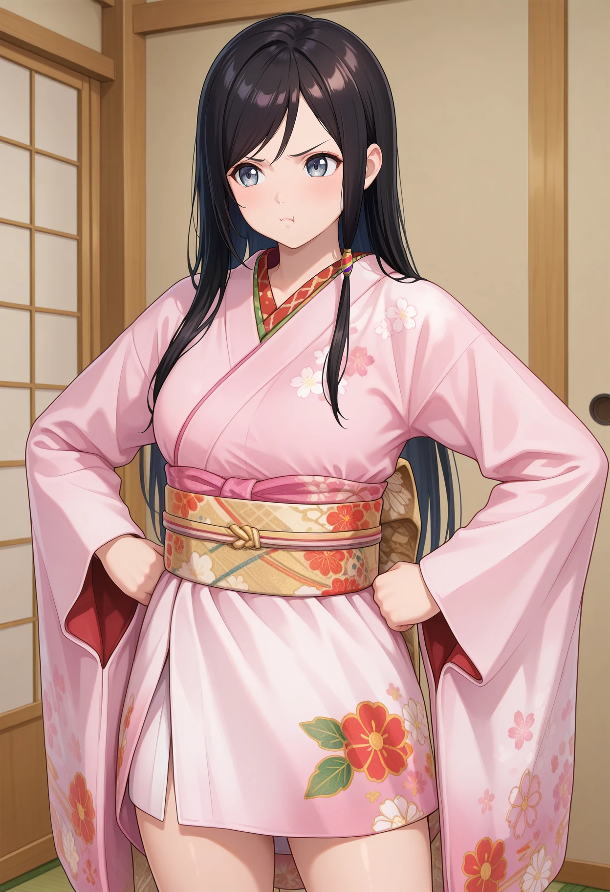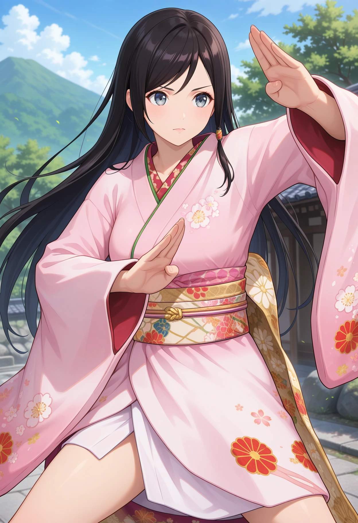 outfit1aakokoro, long hair, black hair, hair ornament, grey eyes, print kimono, pink kimono, long sleeves, wide sleeves, sash, obi