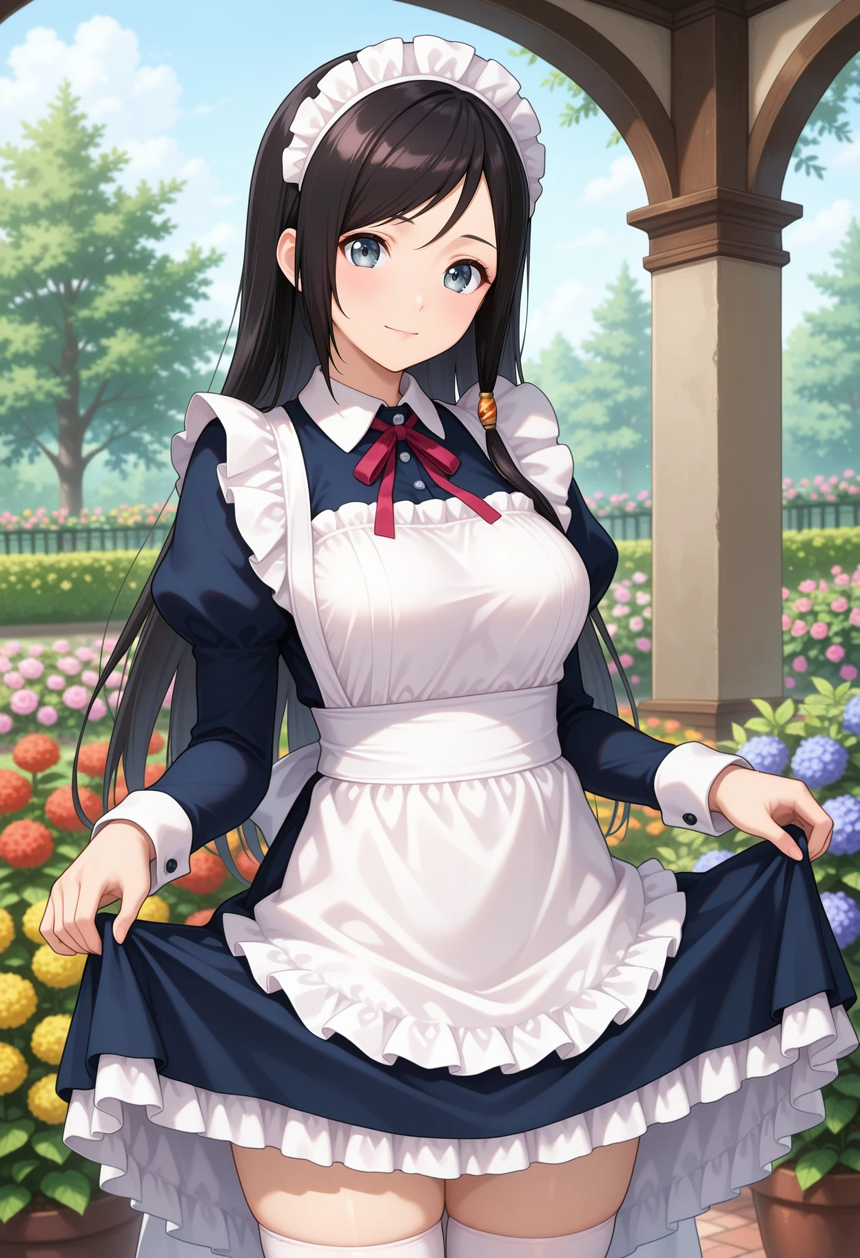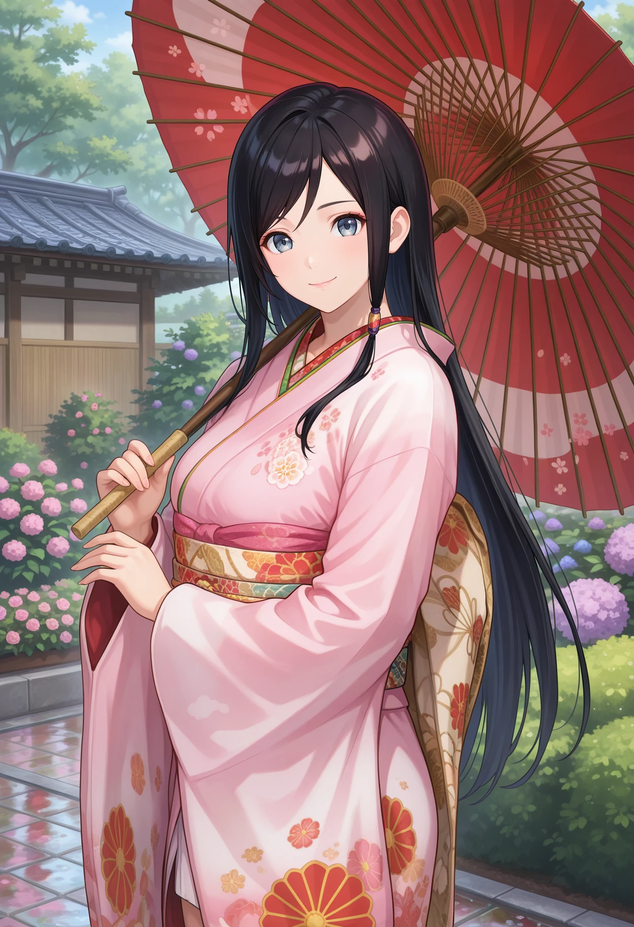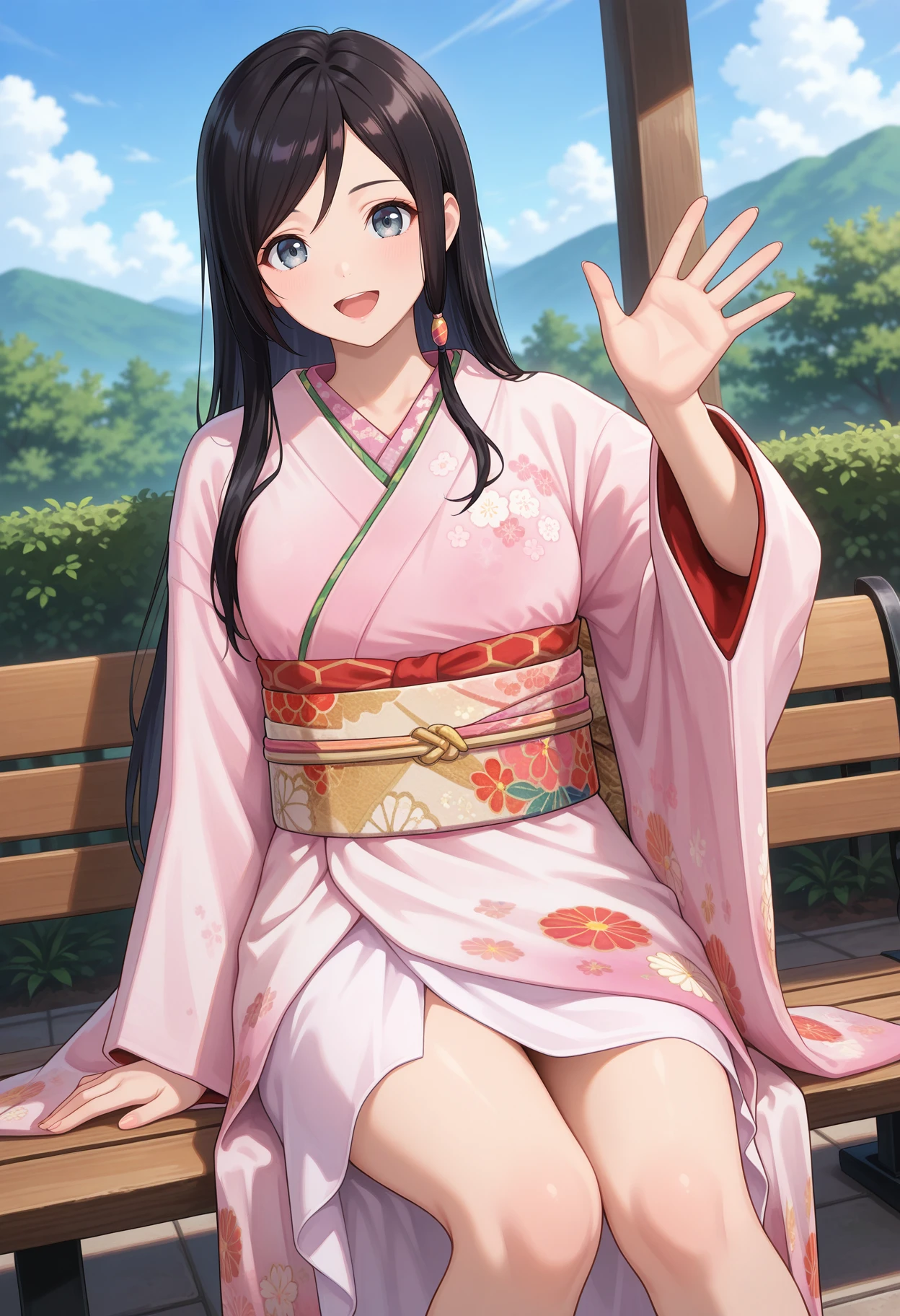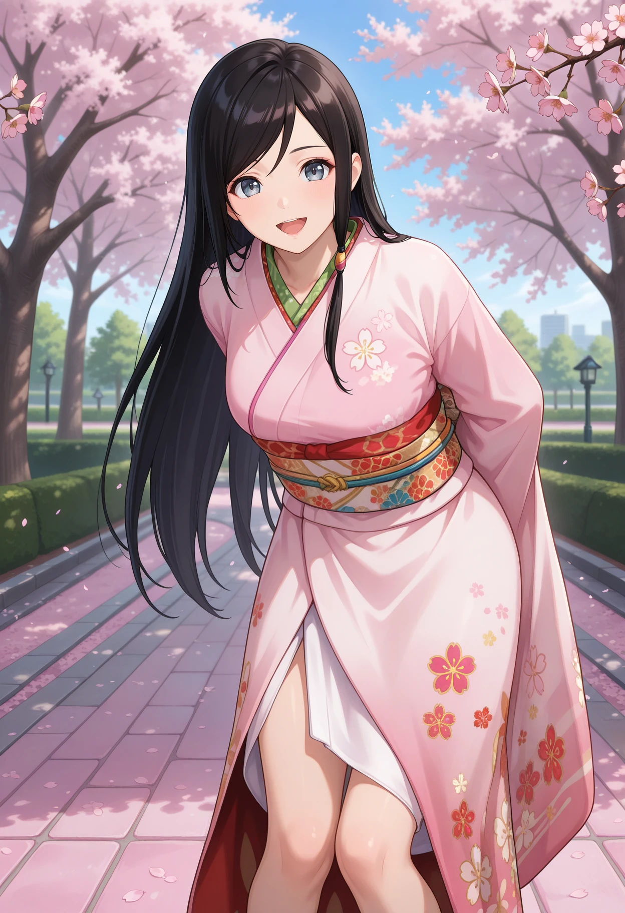 outfit1aakokoro, long hair, black hair, hair ornament, grey eyes, print kimono, pink kimono, long sleeves, wide sleeves, sash, obi
