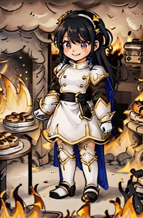 best prompt: detail of luca blight apperance, like blue cape, white armor, evil smile, evil grin, etc