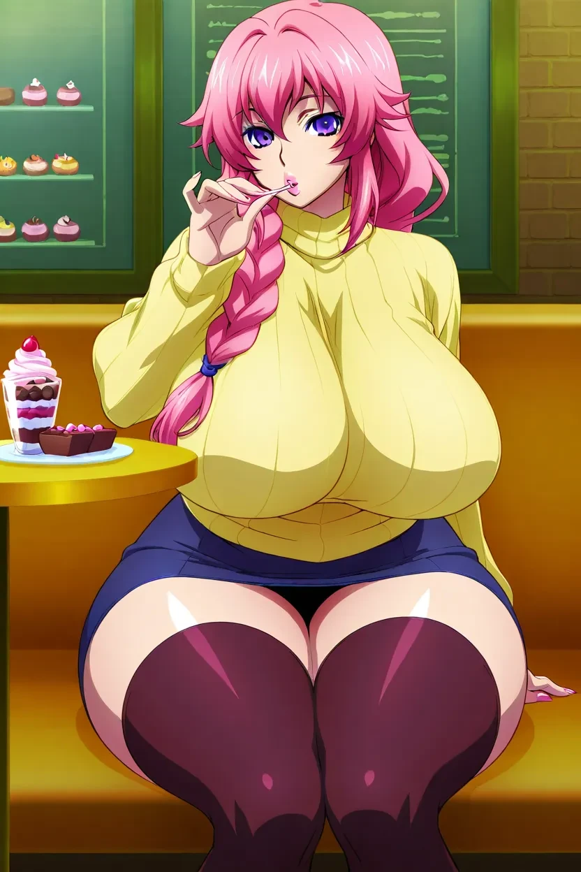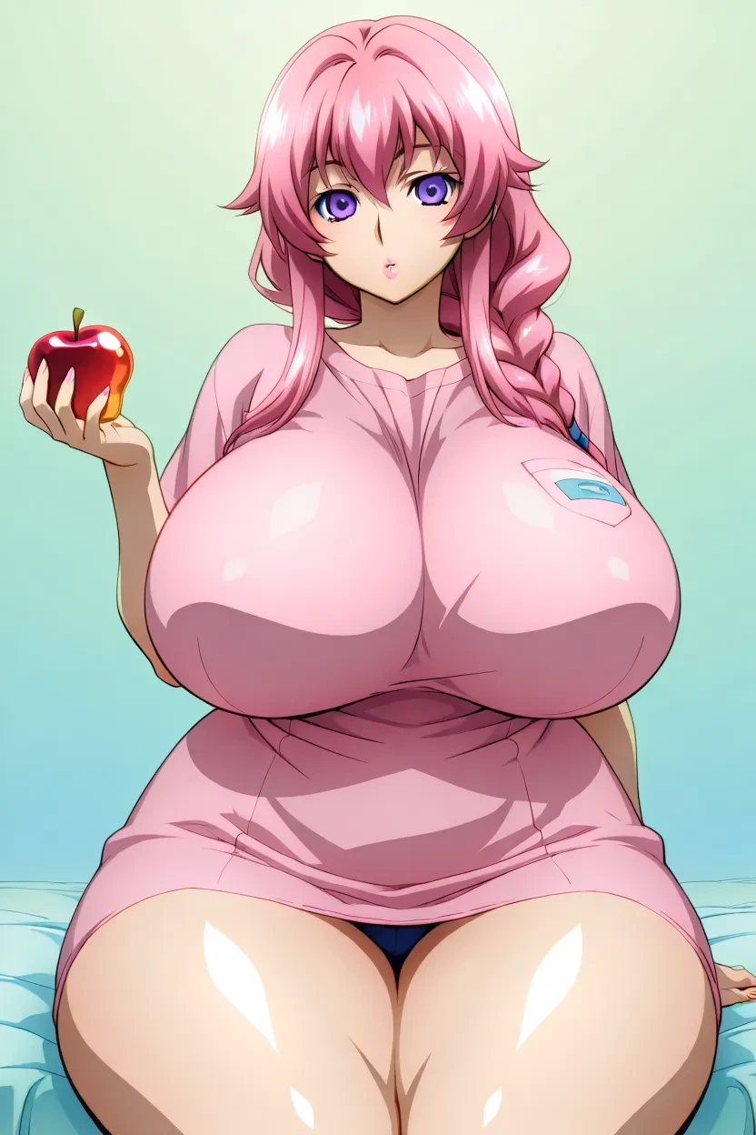 1girl, Mia Roxy, long hair, pink hair, braid, purple eyes, glossy lips, massive , curvy, wide , thick thighs, anime_style, anime_coloring, HD, 4k, Hi-res, excellent quality,