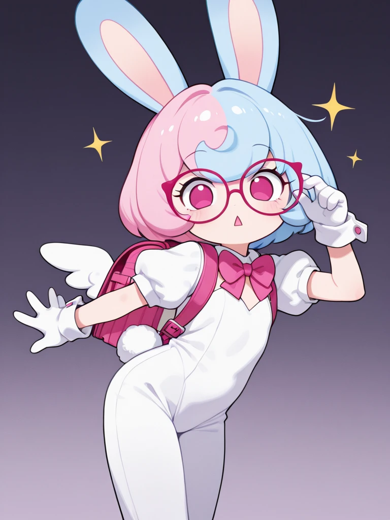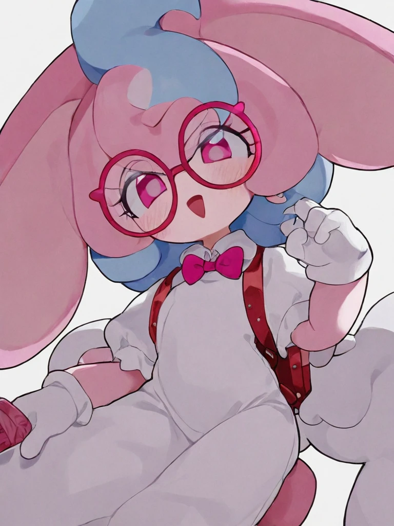Trigger words: mbc, 1girl, solo, pink hair, blue hair, multicolored hair, eyelashes, long ears, bunny ears, multicolored ears, pink ear, blue ear, short hair, (no nose), glasses, pink eyes, solid color eyes, no humans, furry, fair skin,