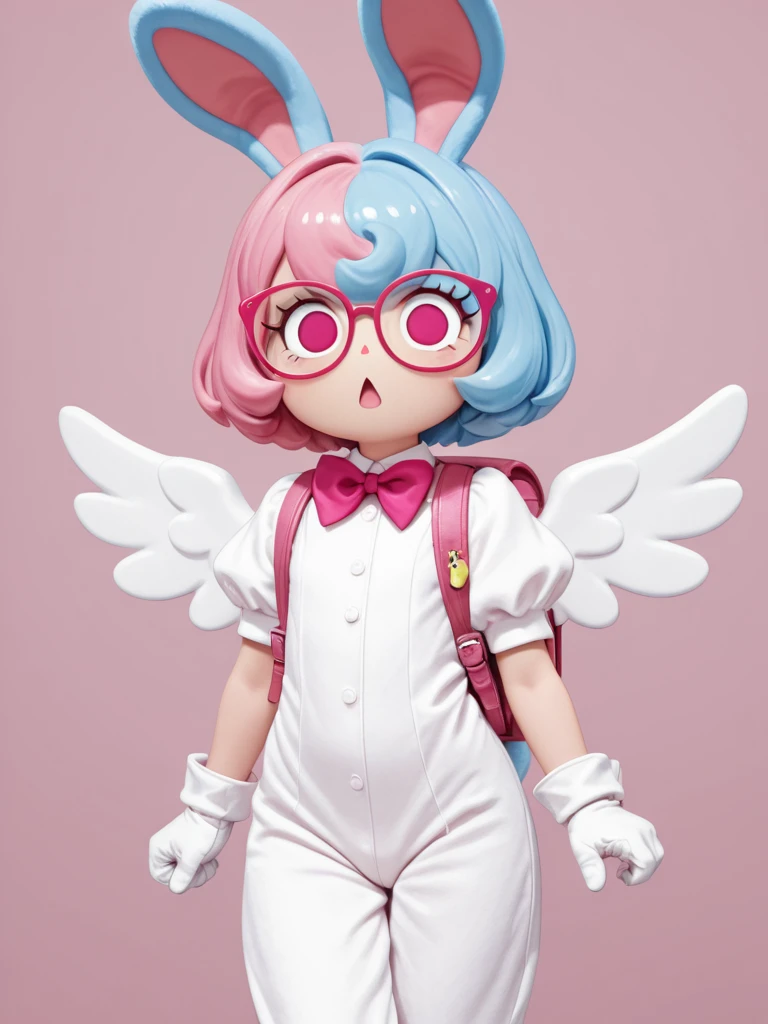 Optional: happy, open mouth, white onesie, puffy sleeves, white gloves, pink bowtie, low wings, white wings, bunny tail, pink backpack