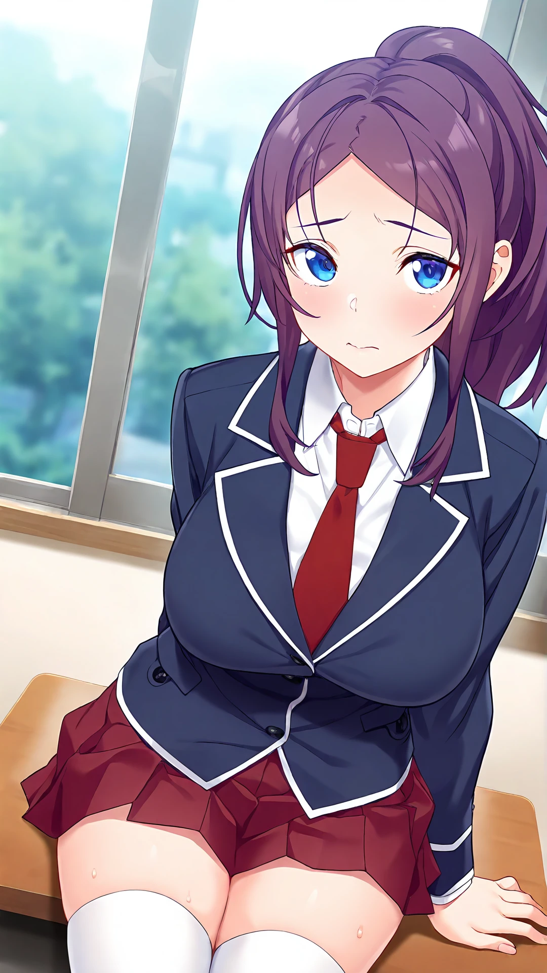 ,Nitta Iroha,1girl,solo,blue eyes,skirt,thighhighs,necktie,school uniform,breasts,large breasts,ponytail,pleated skirt,purple hair,white thighhighs,red necktie,zettai ryouiki,long hair,blazer,jacket,red skirt,