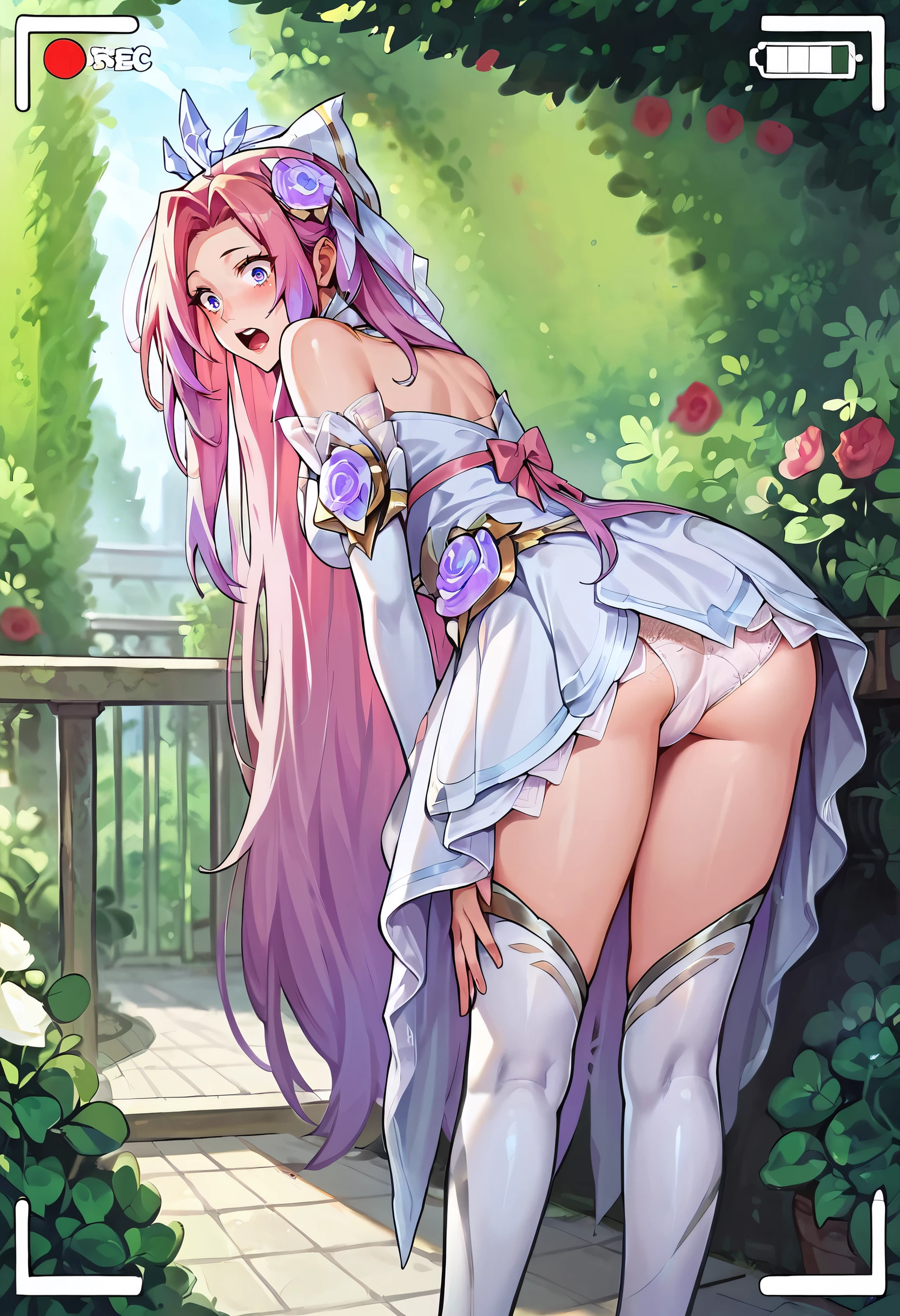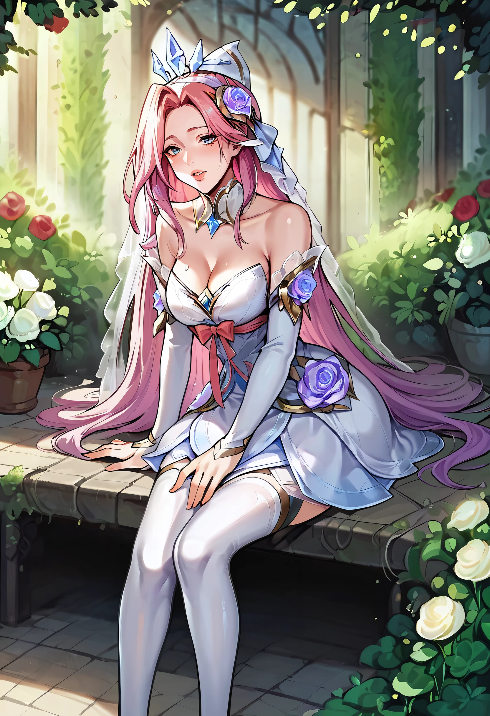 seraphinecrxl, hair ornament, white dress, detached sleeves, bare shoulders, thighhighs