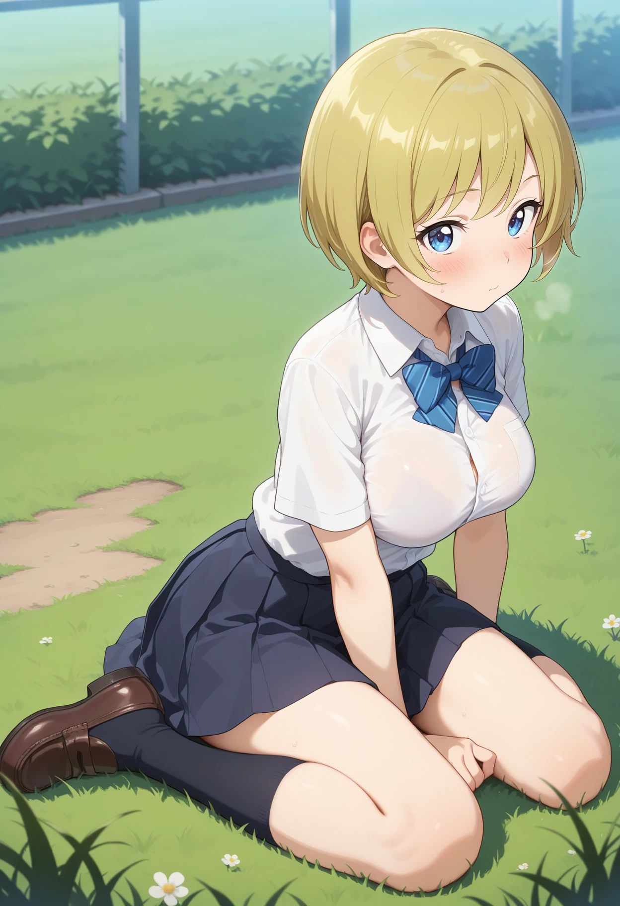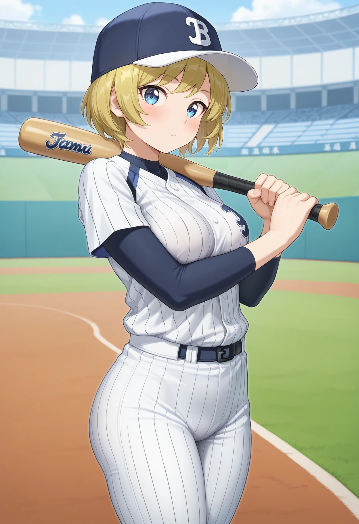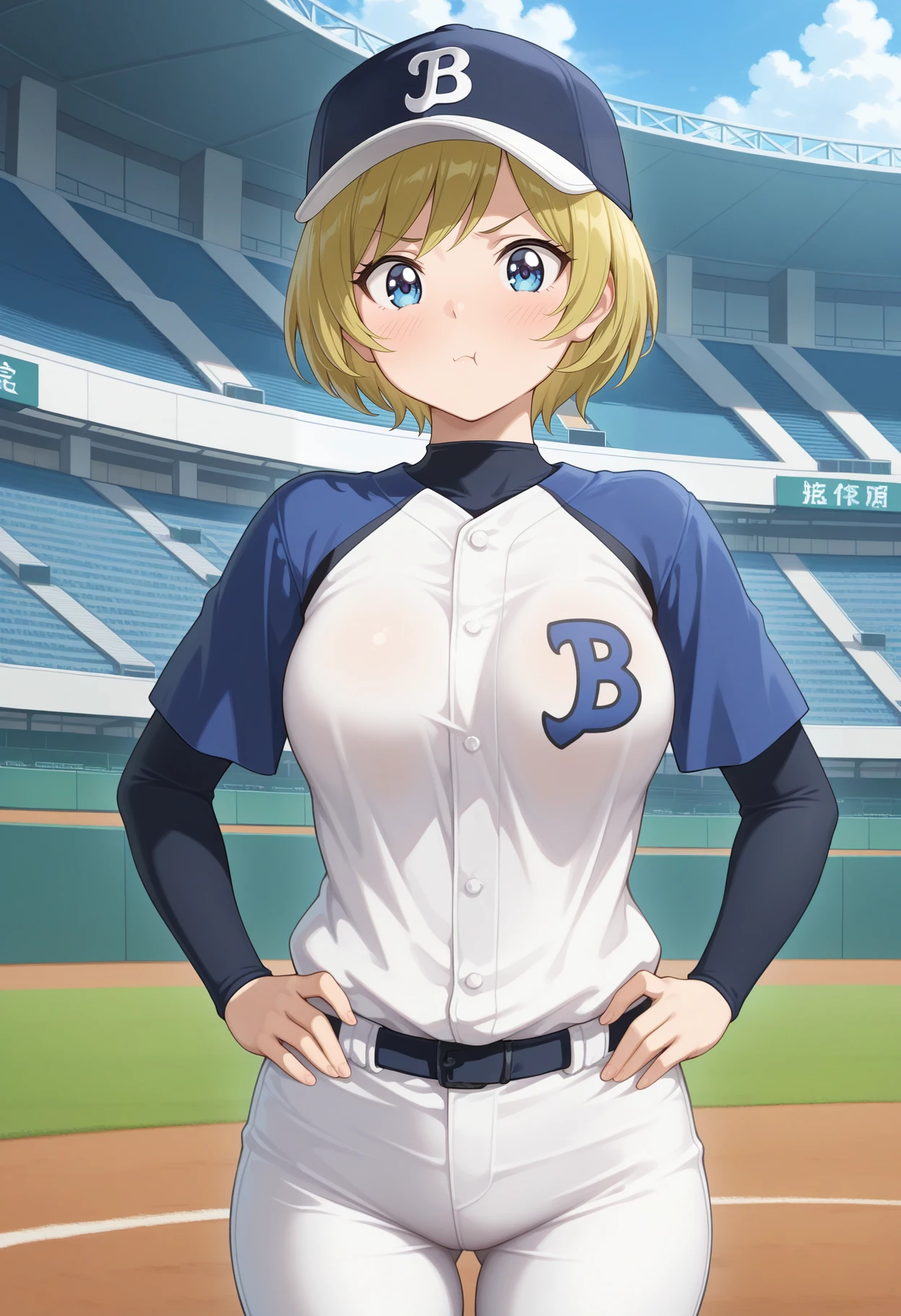 outfit1aamichiru, short hair, blonde hair, baseball cap, blue eyes, breasts, sportswear, baseball uniform, pants