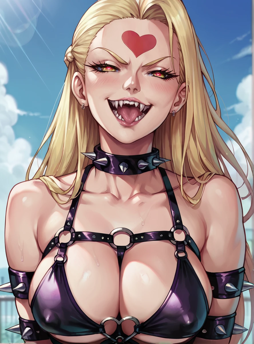 Prompts: 1girl, breasts, long hair, blonde hair, mask, bondage outfit, colored sclera, facial mark, spikes, large breasts, forehead mark, black sclera, spiked collar