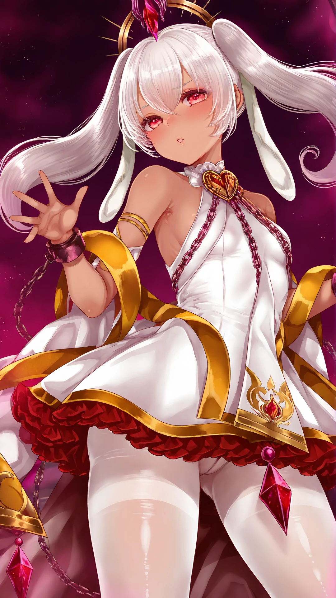 Kusabiseijo, 1girl, solo, small breasts, dark skin, dark-skinned female, white hair, long hair, twintails, red eyes, dress, white dress, bare shoulders, pantyhose, white pantyhose, chain, cuffs,