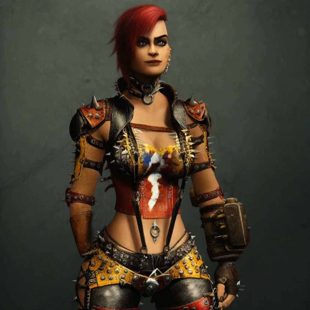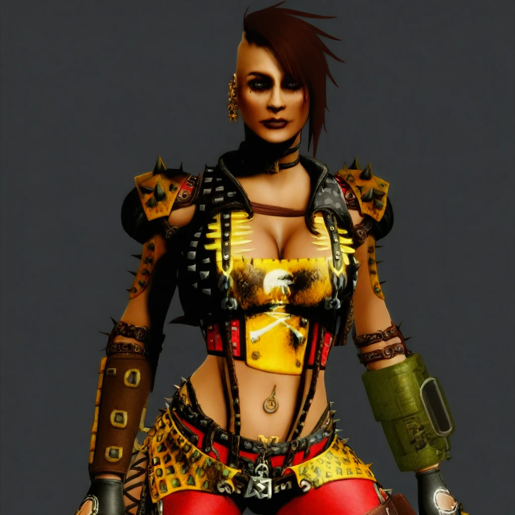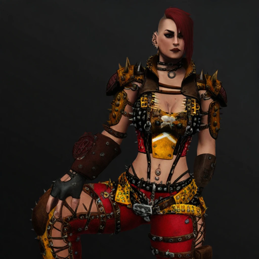 Fallout_Toxic, ((leather: laced pants, bustier, suspenders, spiked shoulder pads, gauntlets, vest, belt)), spiked leather, studded leather, cleavage, body piercings, pentagram, fingerless gloves, thigh laced pants, bullet belt