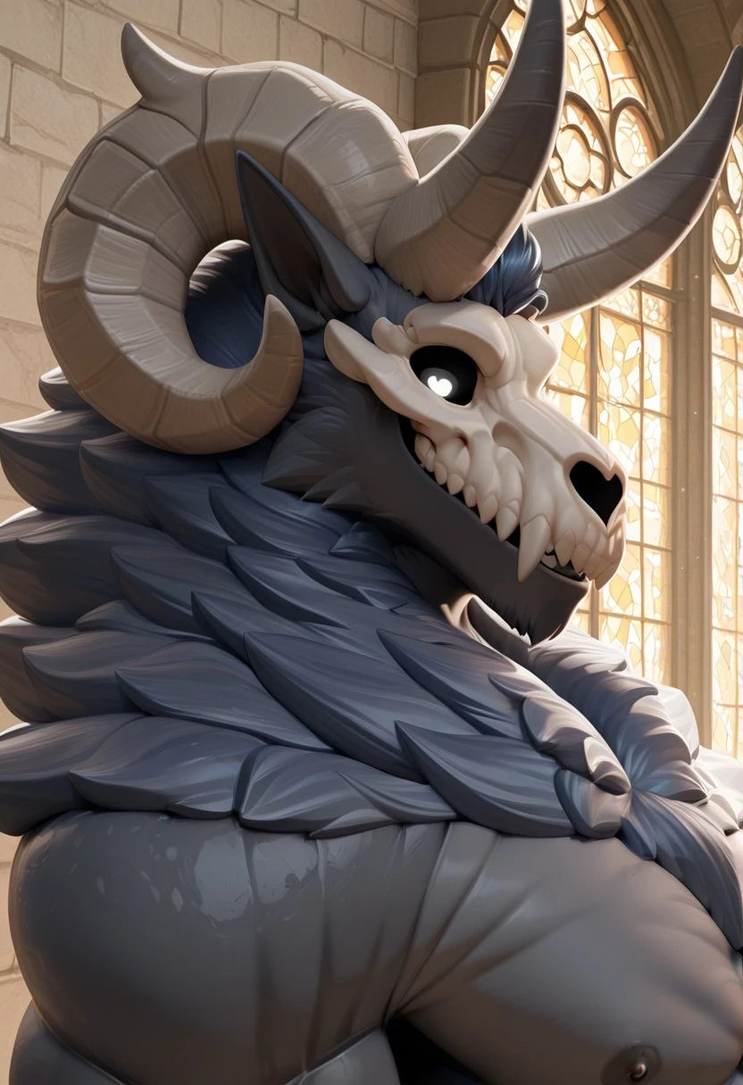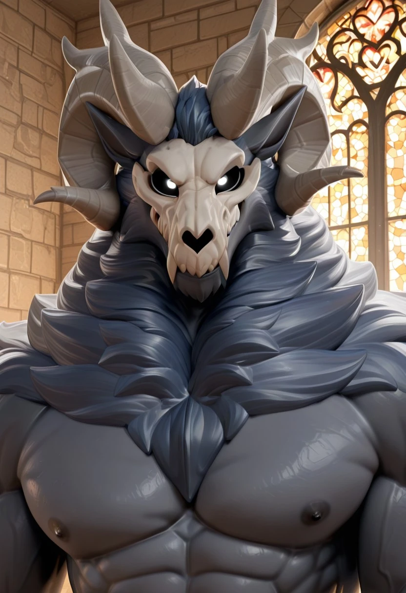 R0drick, Big horns, skull head, wendigo, Black fur, Muscular, Male, White pupils, Black sclera, Mature Male, Pointy ears,