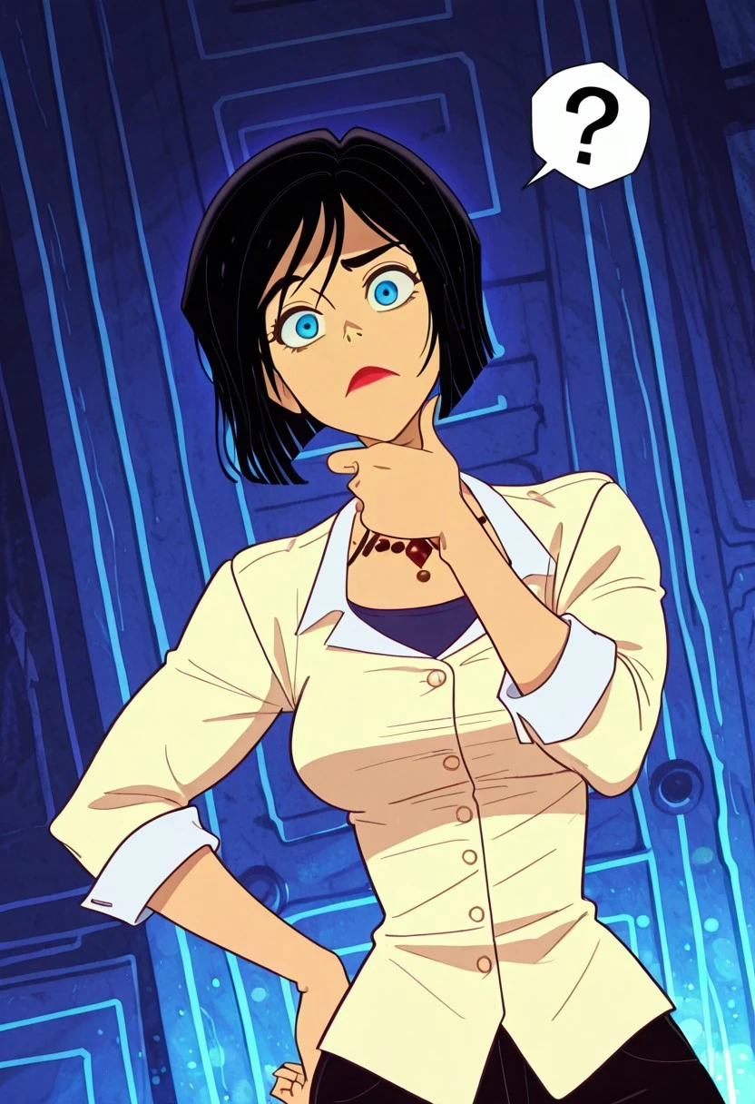 ParkerKovakPP, 1girl, solo, black hair, short hair, bangs, bob cut, blue eyes, nose, red lipstick, necklace, beige jacket, blue shirt, large breast, thick thighs, black pants, buttons, rolled-up sleeves, white collar,