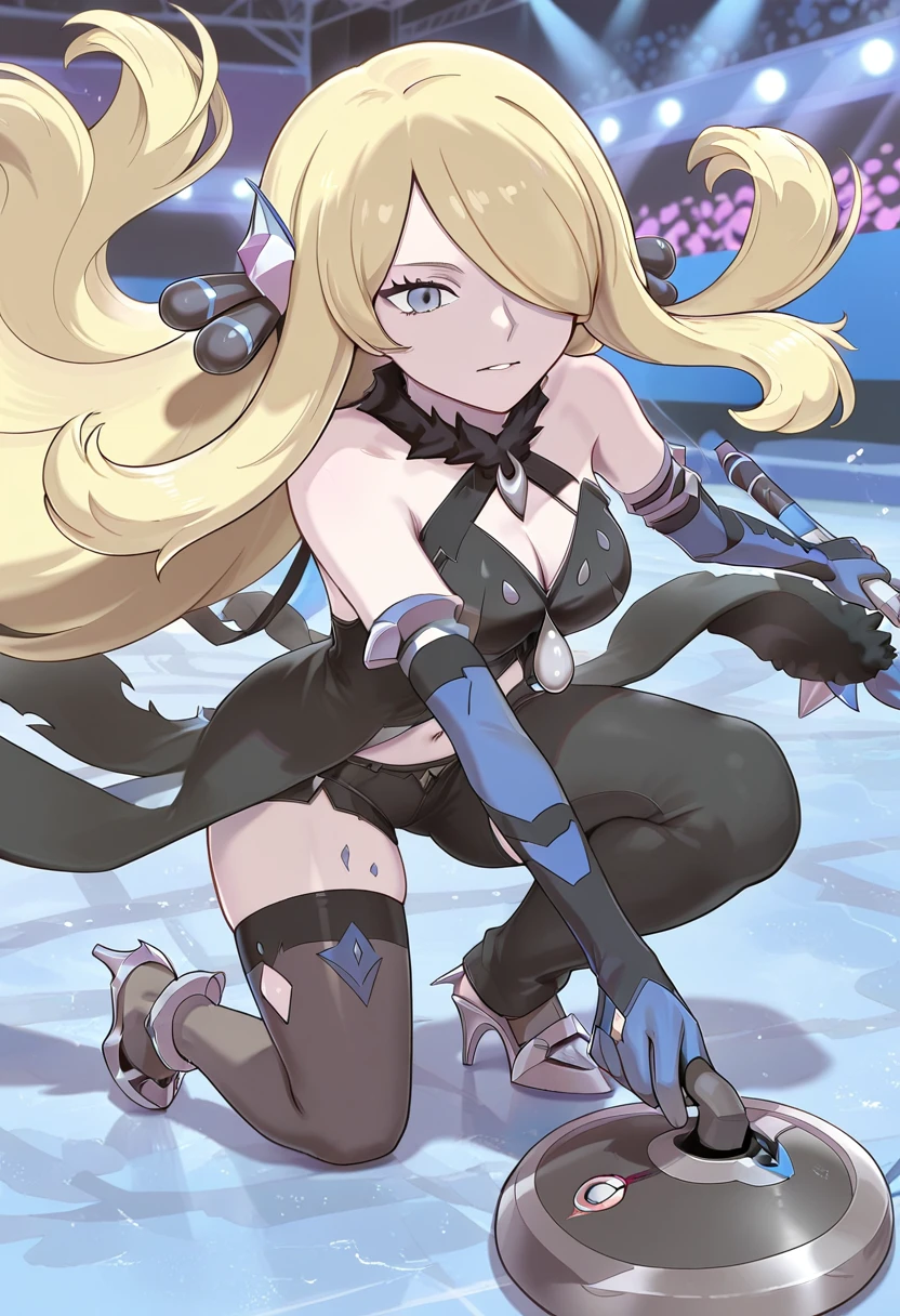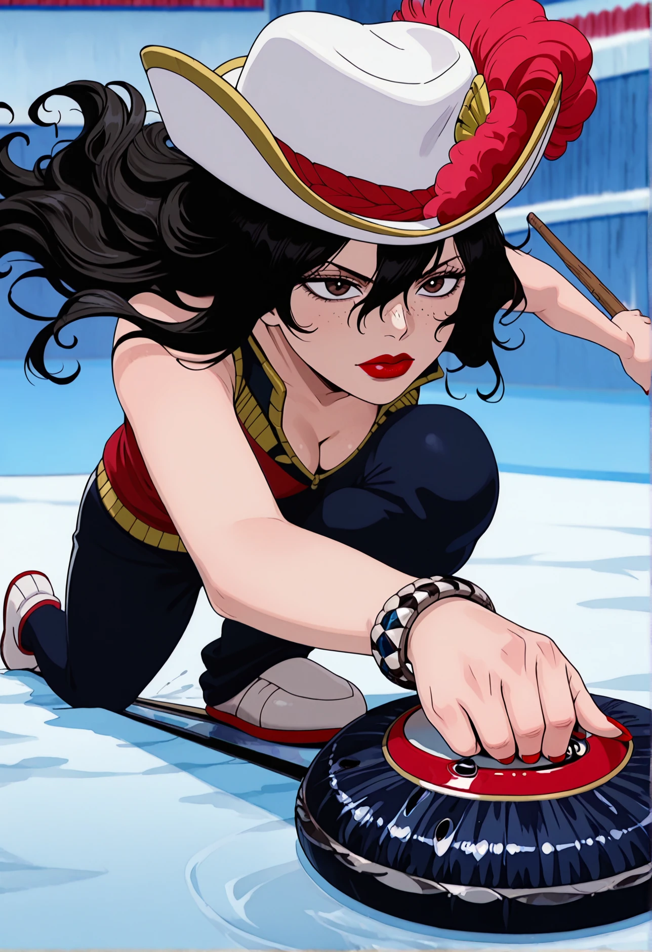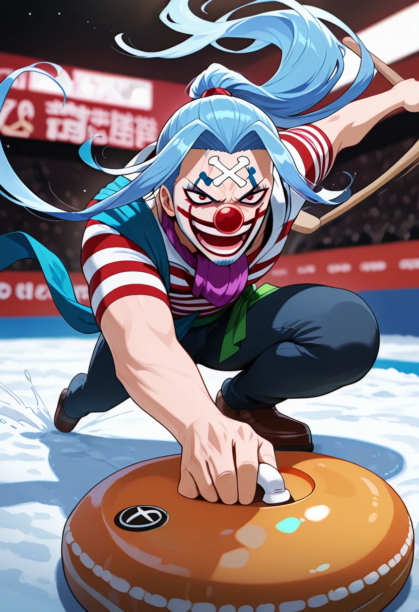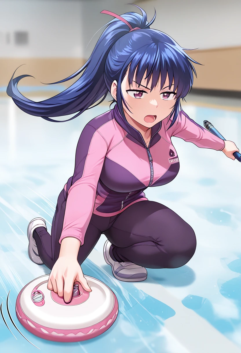 trigger words: curlingdeliverypose, on one knee, sliding, holding curling stone, holding stick