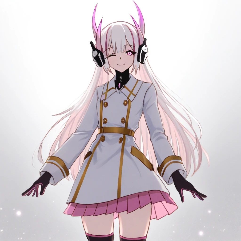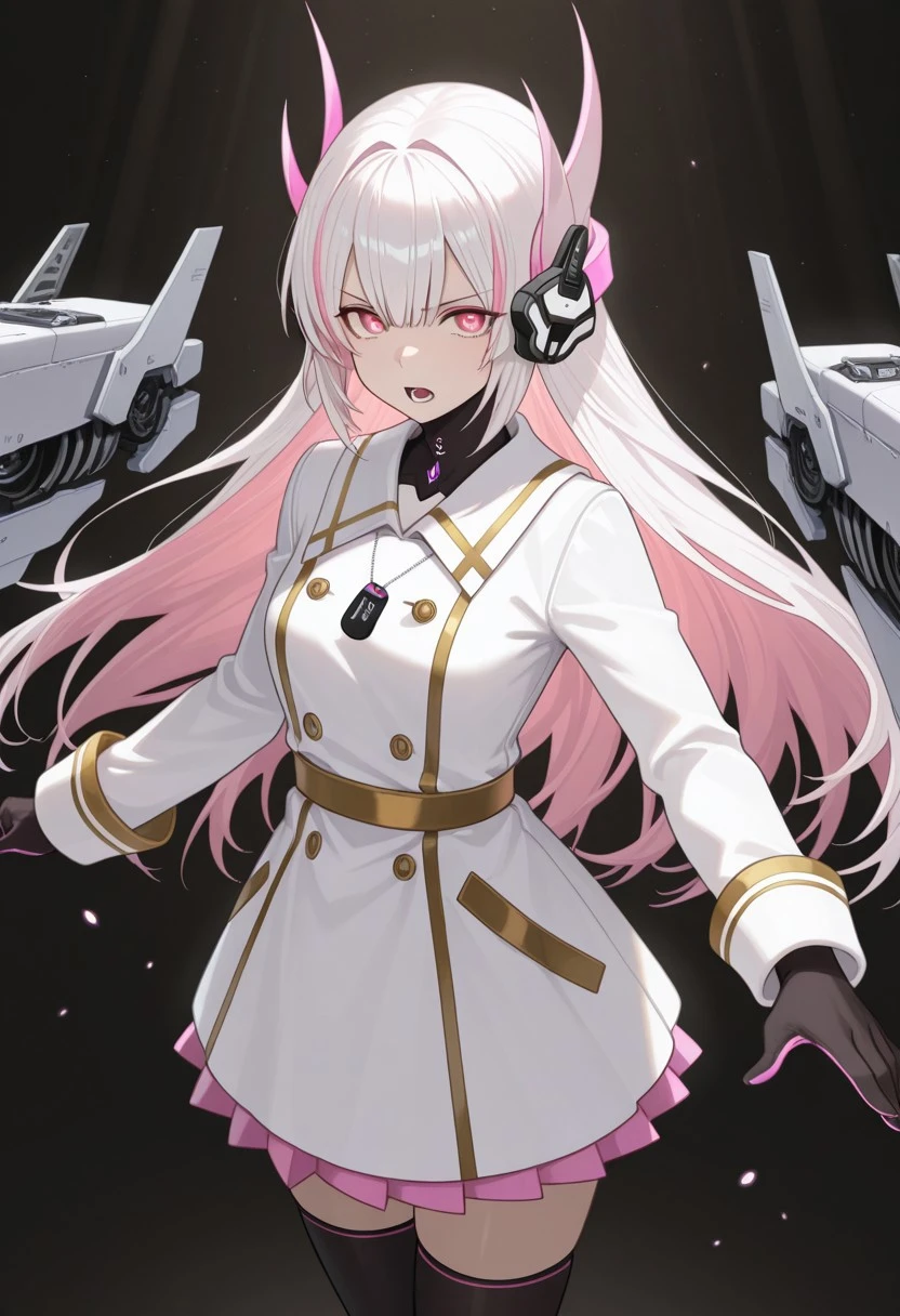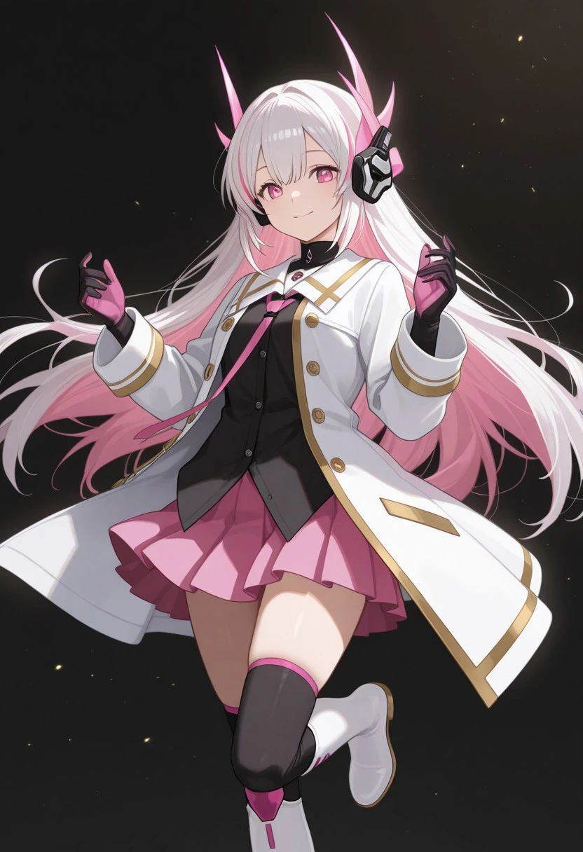 1girl, solo, LivPGR, white hair, long hair, pink eyes, black and white headphones, pink horns and headband, LivEclipsePGR, white double-breasted dress with gold trim, gold waistband, black undershirt, skirt under dress, pink pleated skirt, black gloves, black thighhighs with pink trims, white kneeboots with pink highlights, short dress, short skirt