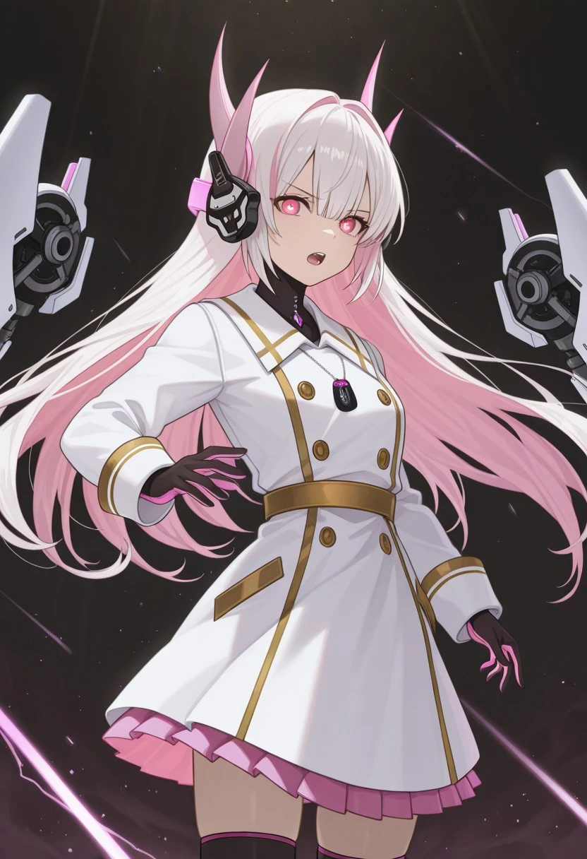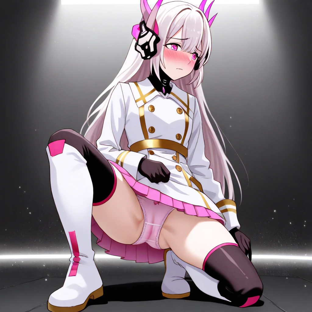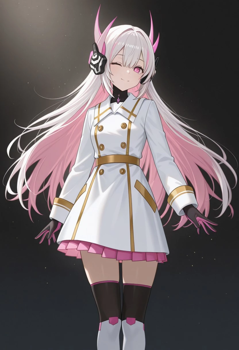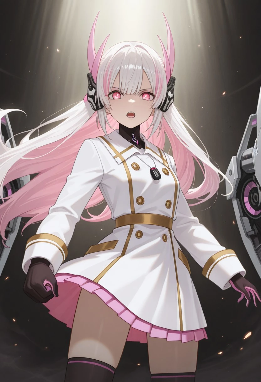 1girl, solo, LivPGR, white hair, long hair, pink eyes, black and white headphones, pink horns and headband, LivEclipsePGR, white double-breasted dress with gold trim, gold waistband, black undershirt, skirt under dress, pink pleated skirt, black gloves, black thighhighs with pink trims, white kneeboots with pink highlights, short dress, short skirt