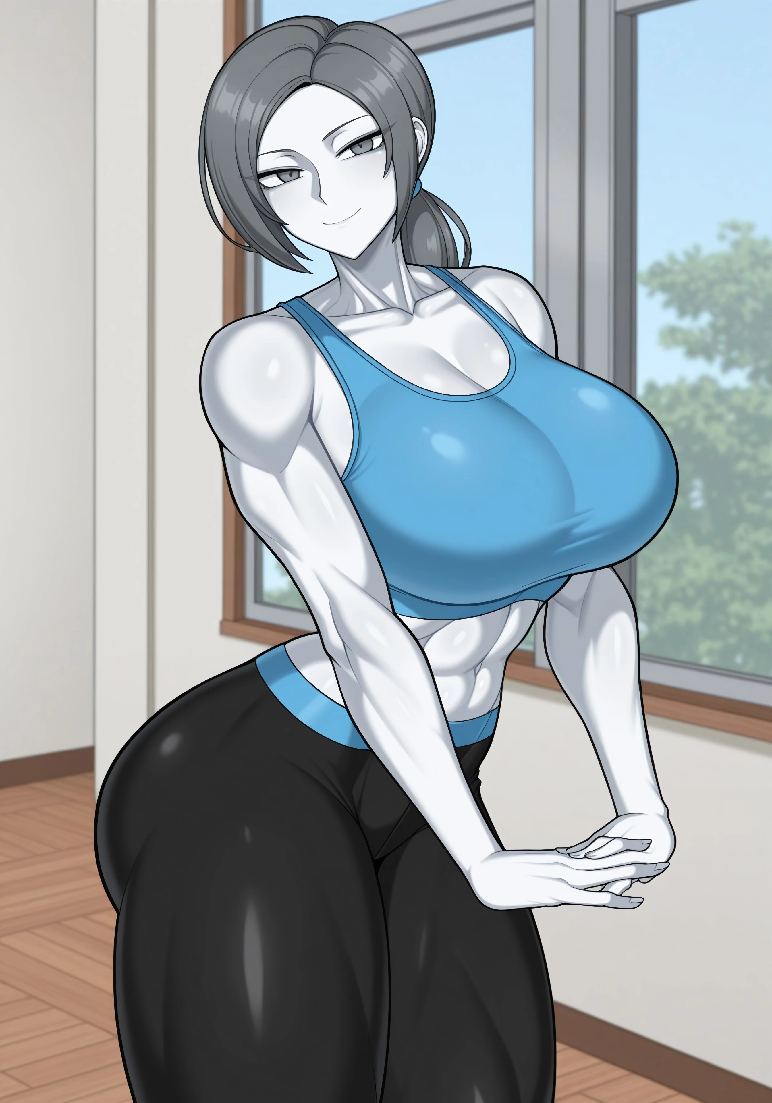 1girl, wii fit trainer, toned, large breasts, white skin, glossy skin, grey eyes, grey hair, ponytail, blue hair tie, glossy outfit, blue sports top, black sports pants, tight pants, blue waistband