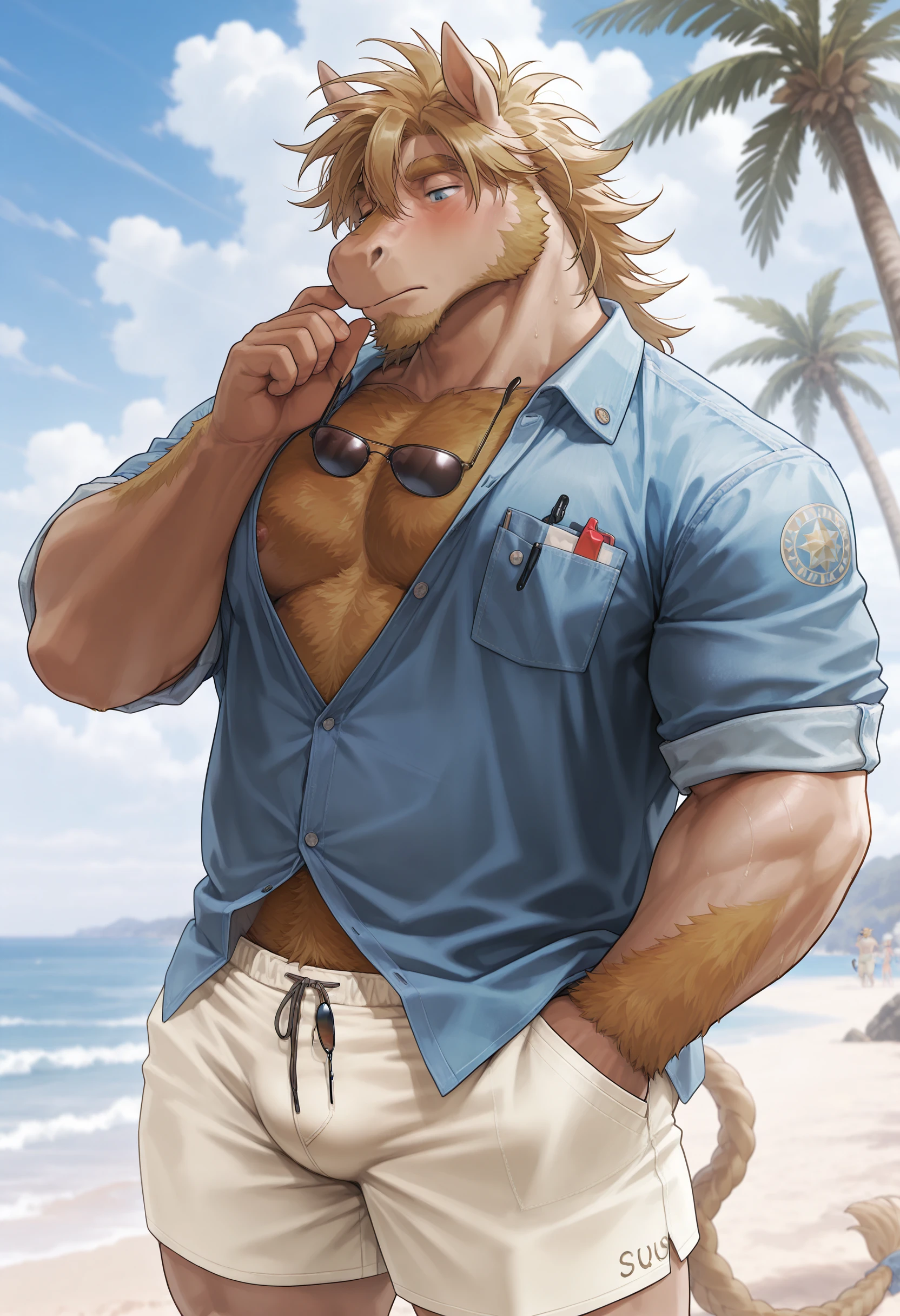 blue denim shirt, rolled up sleeves, sunglasses in shirt pocket, khaki shorts,