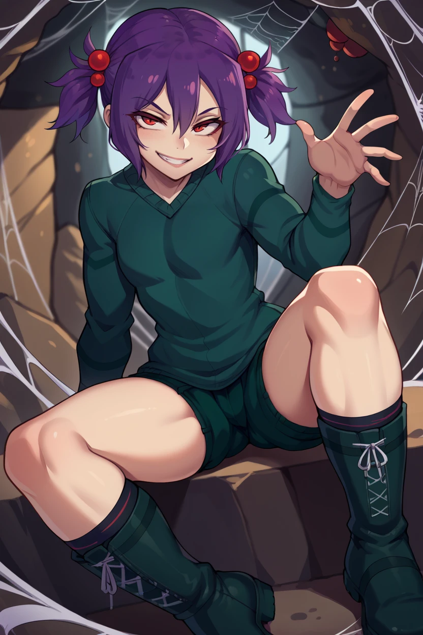Trigger word is "spid3r" and "short twintails, purple hair, hair bobbles" is required.