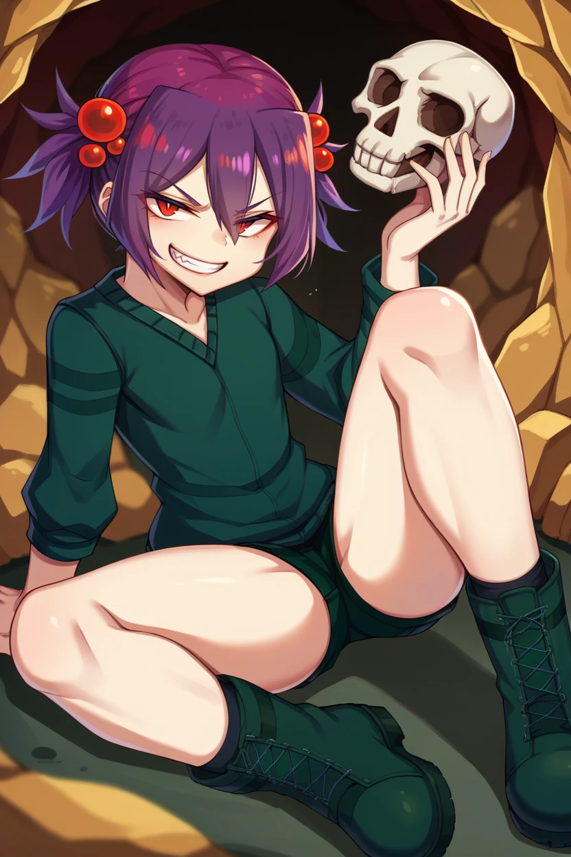 Add "green sweater, green shorts, green boots" for her typical look.