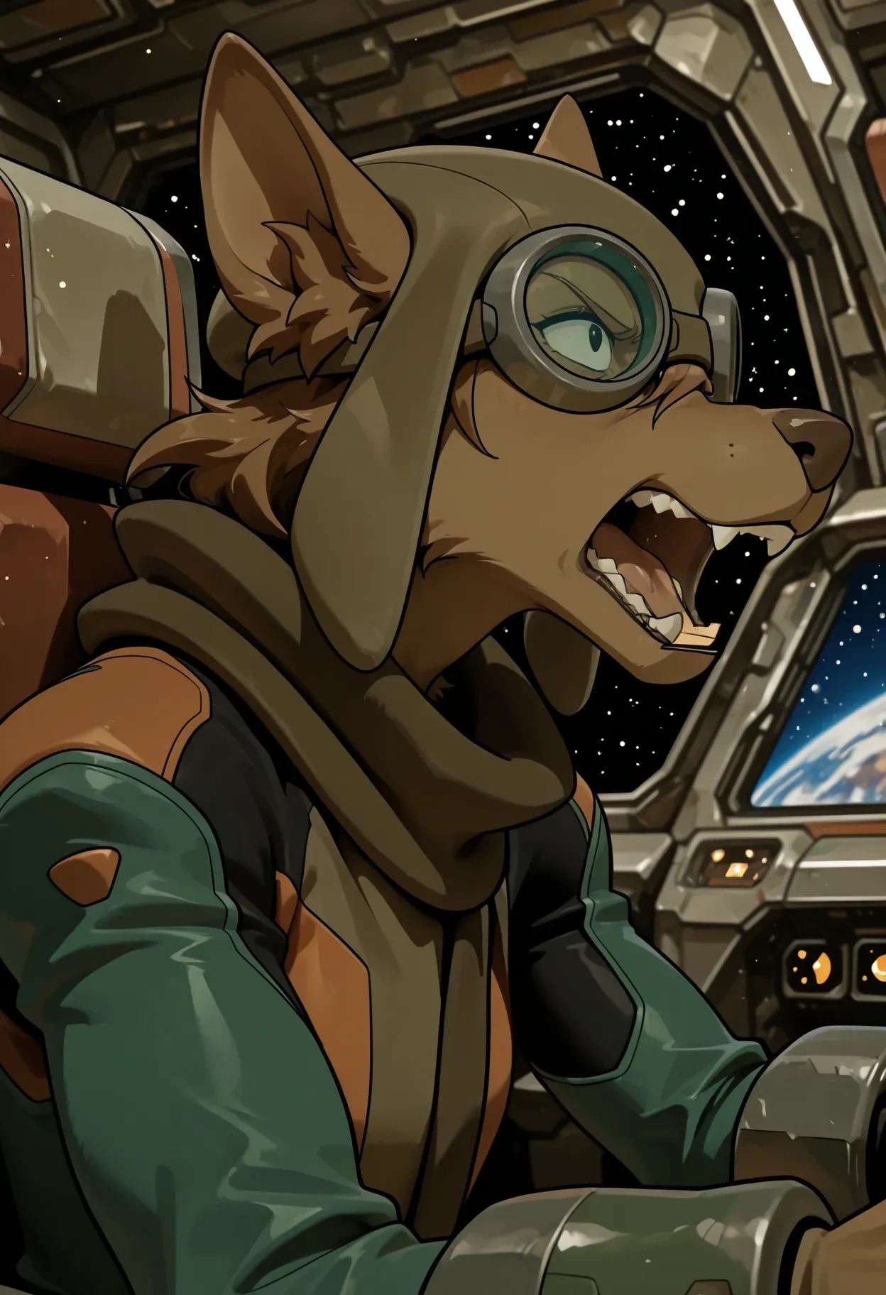 goggles, goggles on head, blue lenses, aviator cap, green cap, brown scarf, flight suit, green and orange suit, brown belt, pouch,