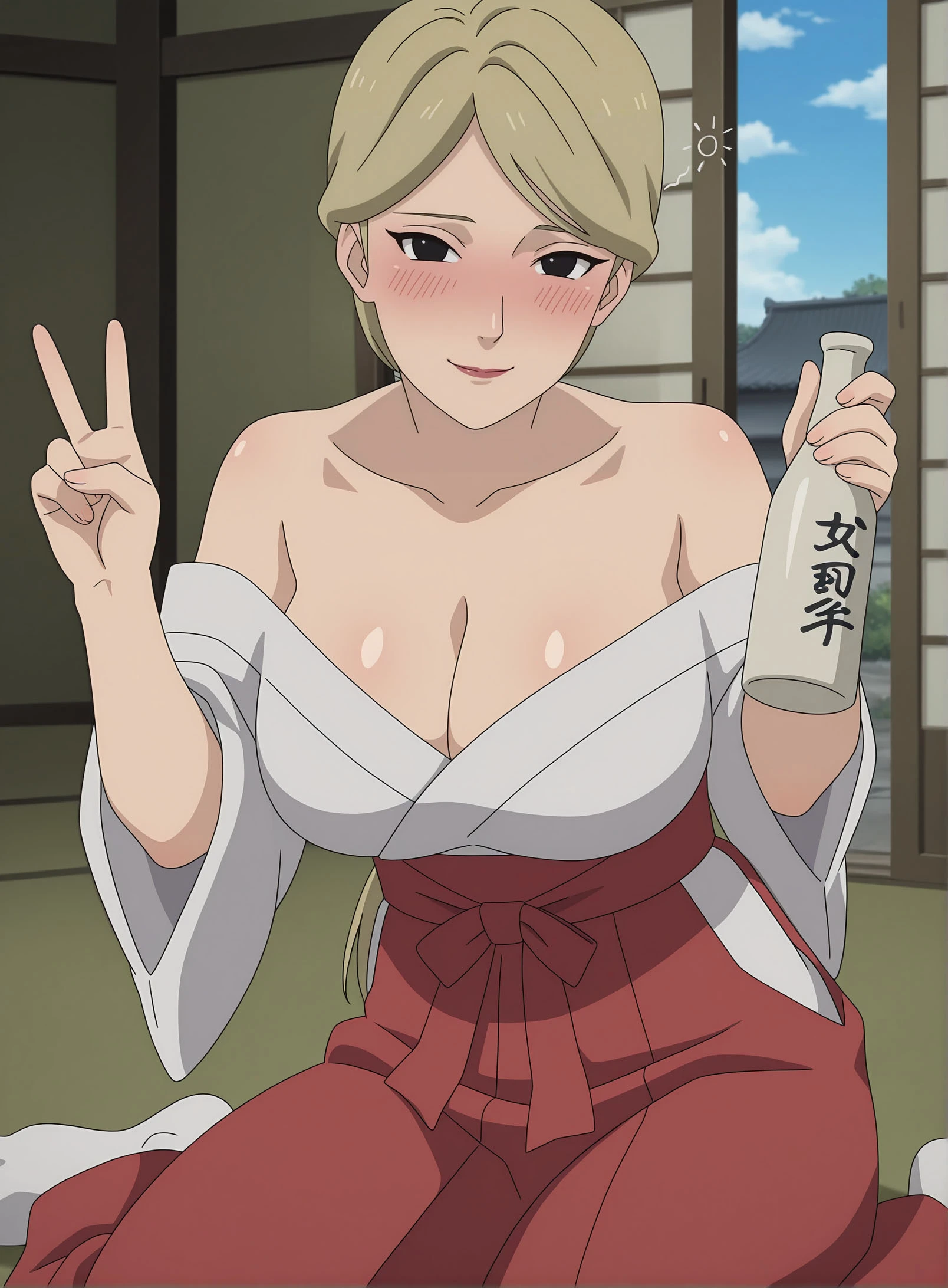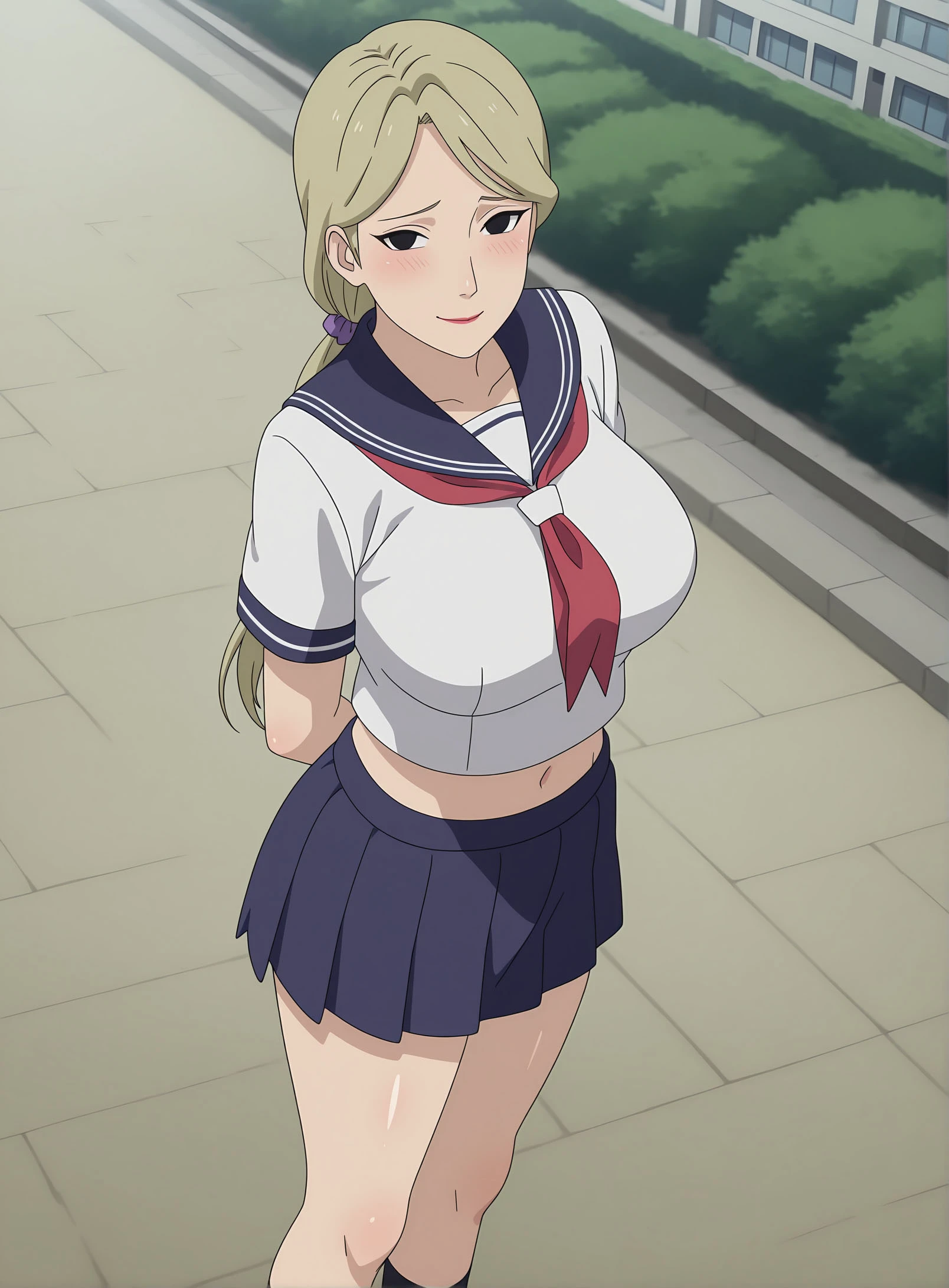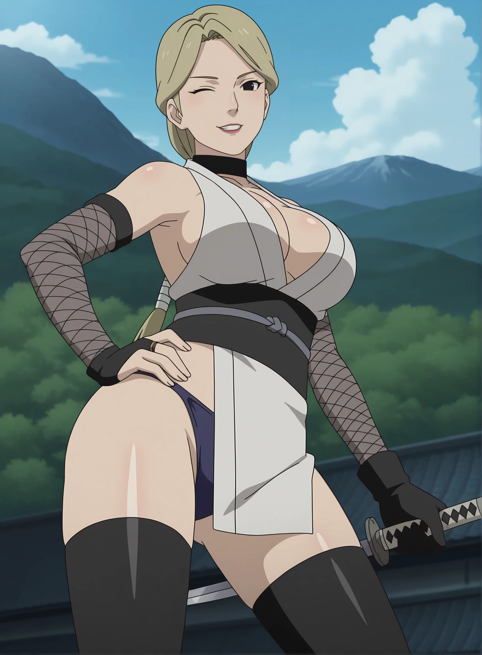 1girl, solo, YugitoNii, blonde hair, black eyes, lipstick, ponytail, large breasts