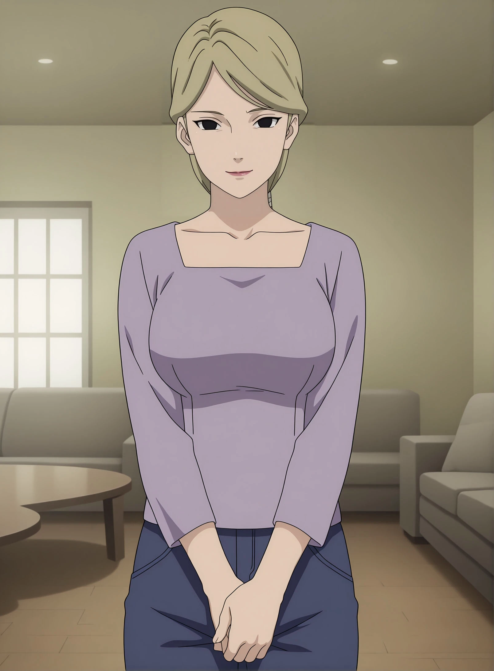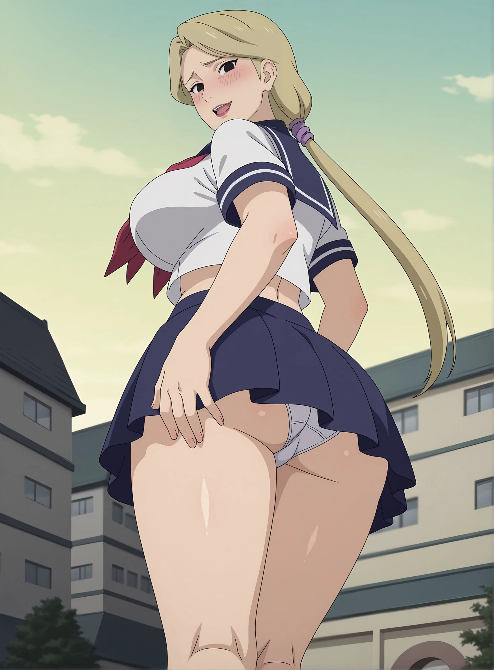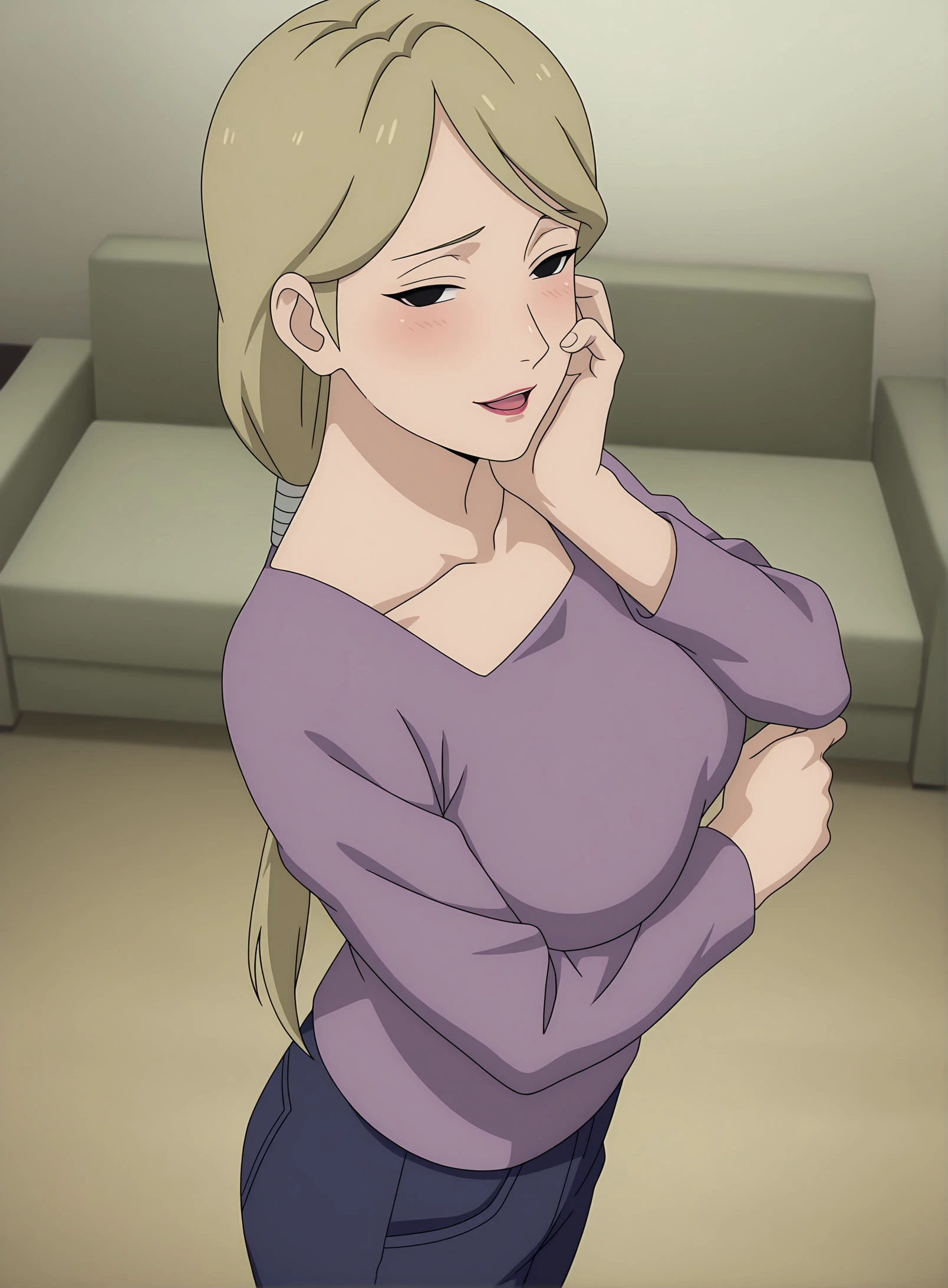 1girl, solo, YugitoNii, blonde hair, black eyes, lipstick, ponytail, large breasts