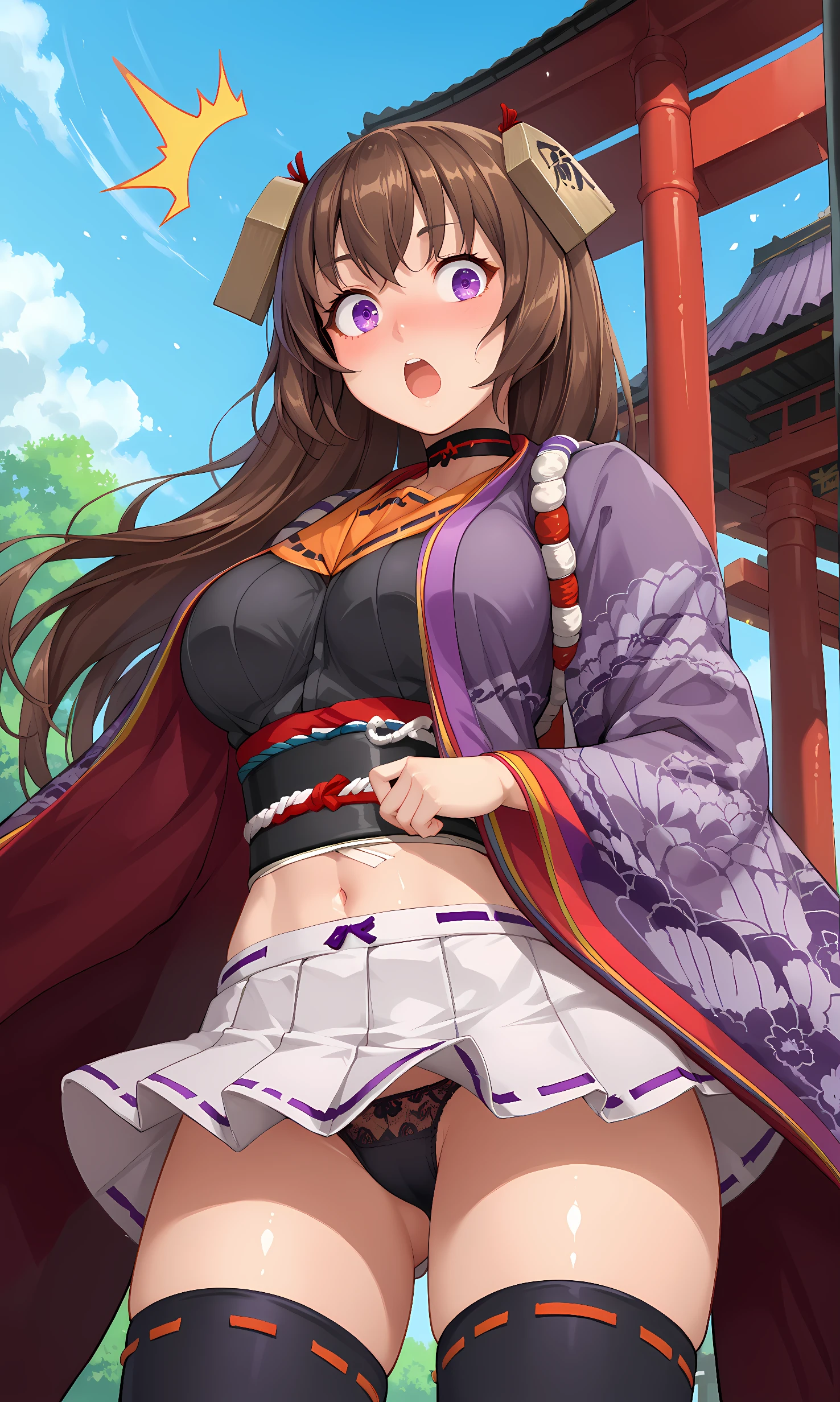 hair ornament, choker, crop top, black top, orange serafuku, black sash, (purple kimono:1.3), open kimono, wide sleeves, kimono print, midriff, white skirt, microskirt, ribbon-trimmed skirt, black thighhighs, ribbon-trimmed legwear, brown boots