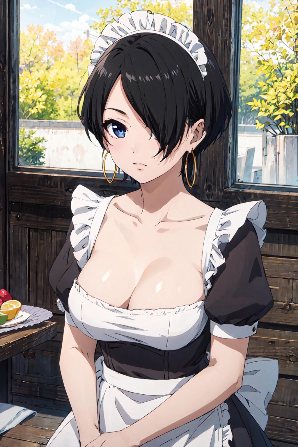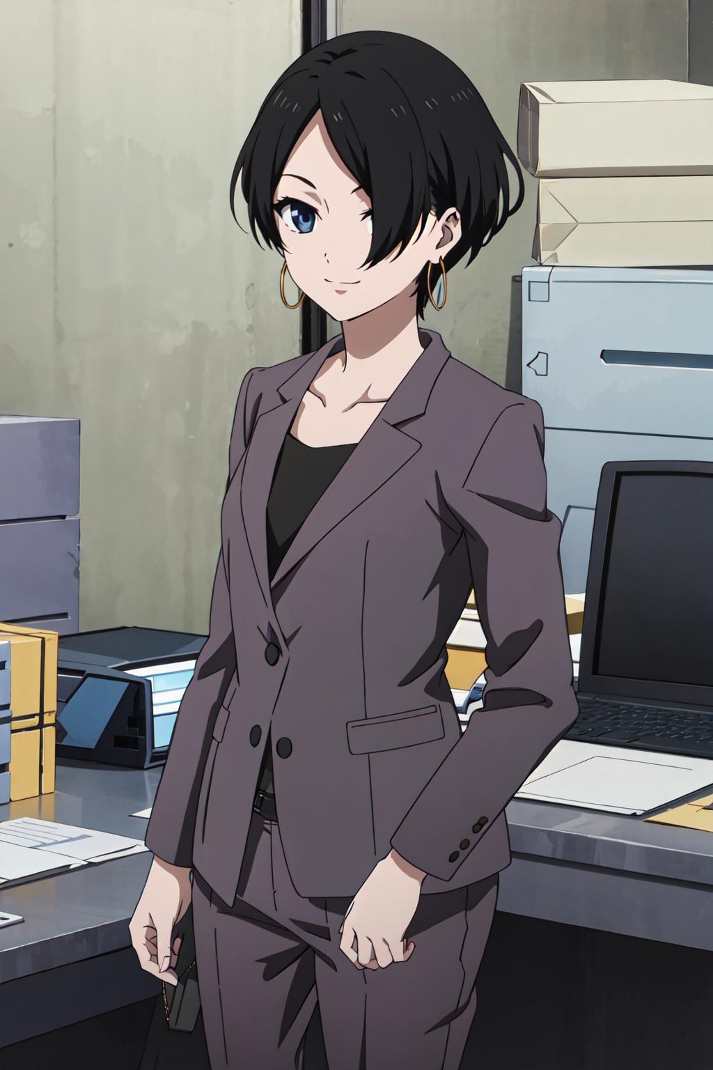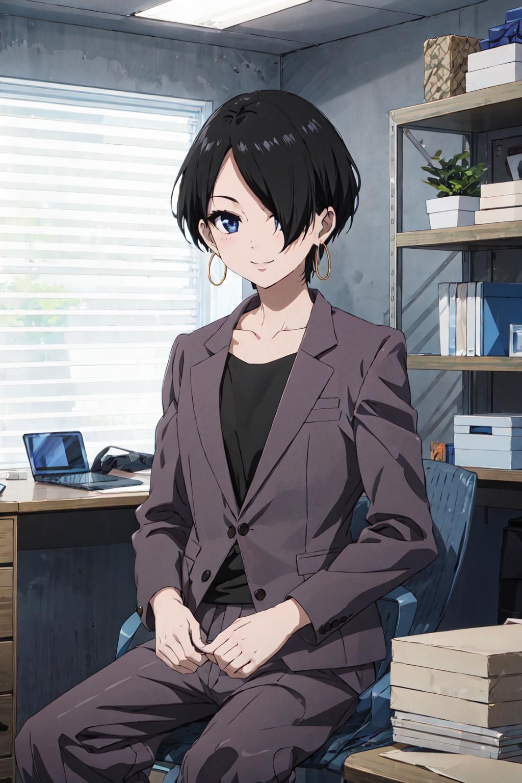 okitsuyuka, hair over one eye, black hair, short hair, blue eyes, earringsClothes / 服 / 衣服: