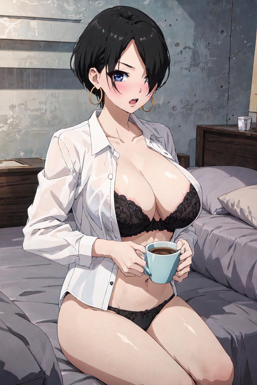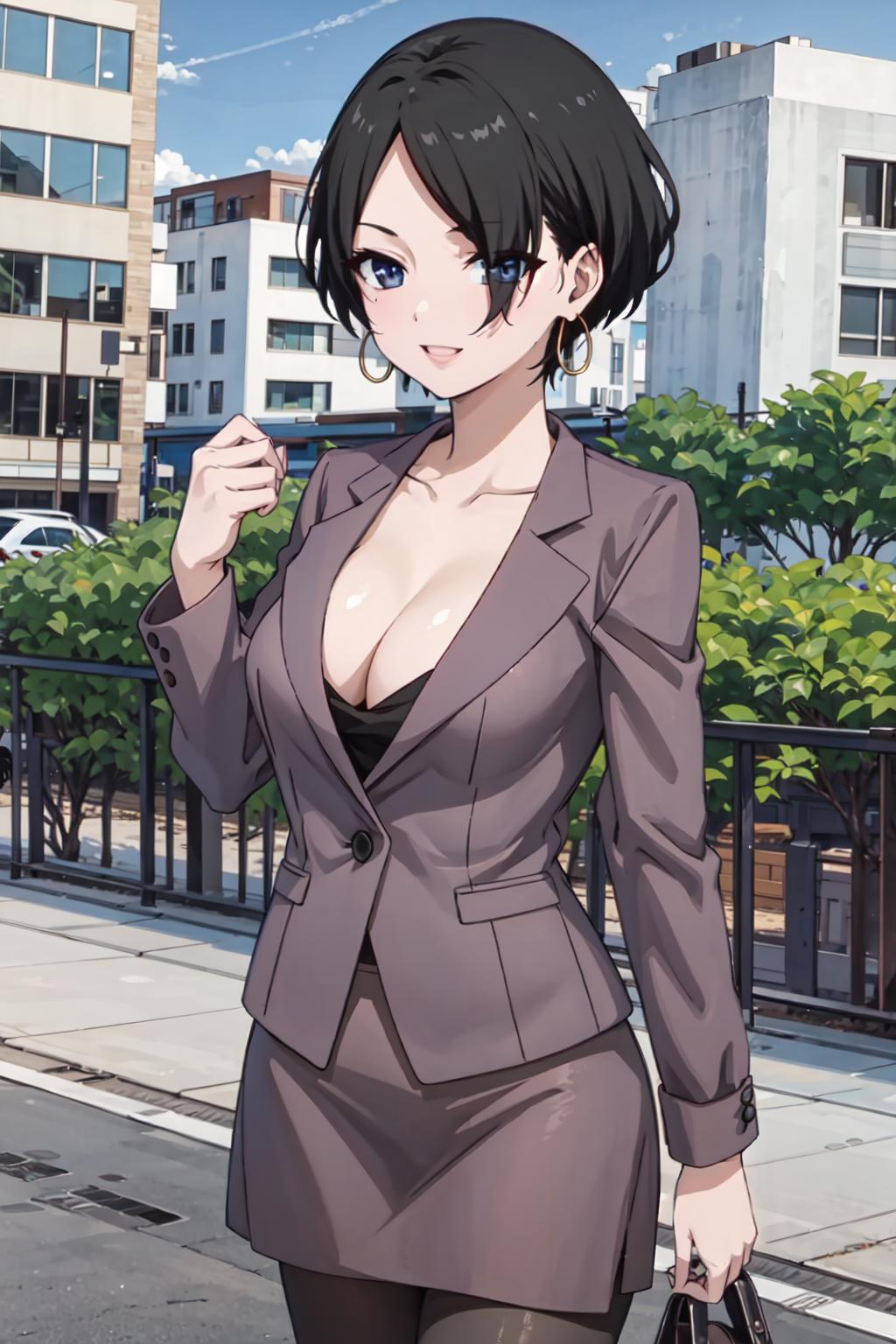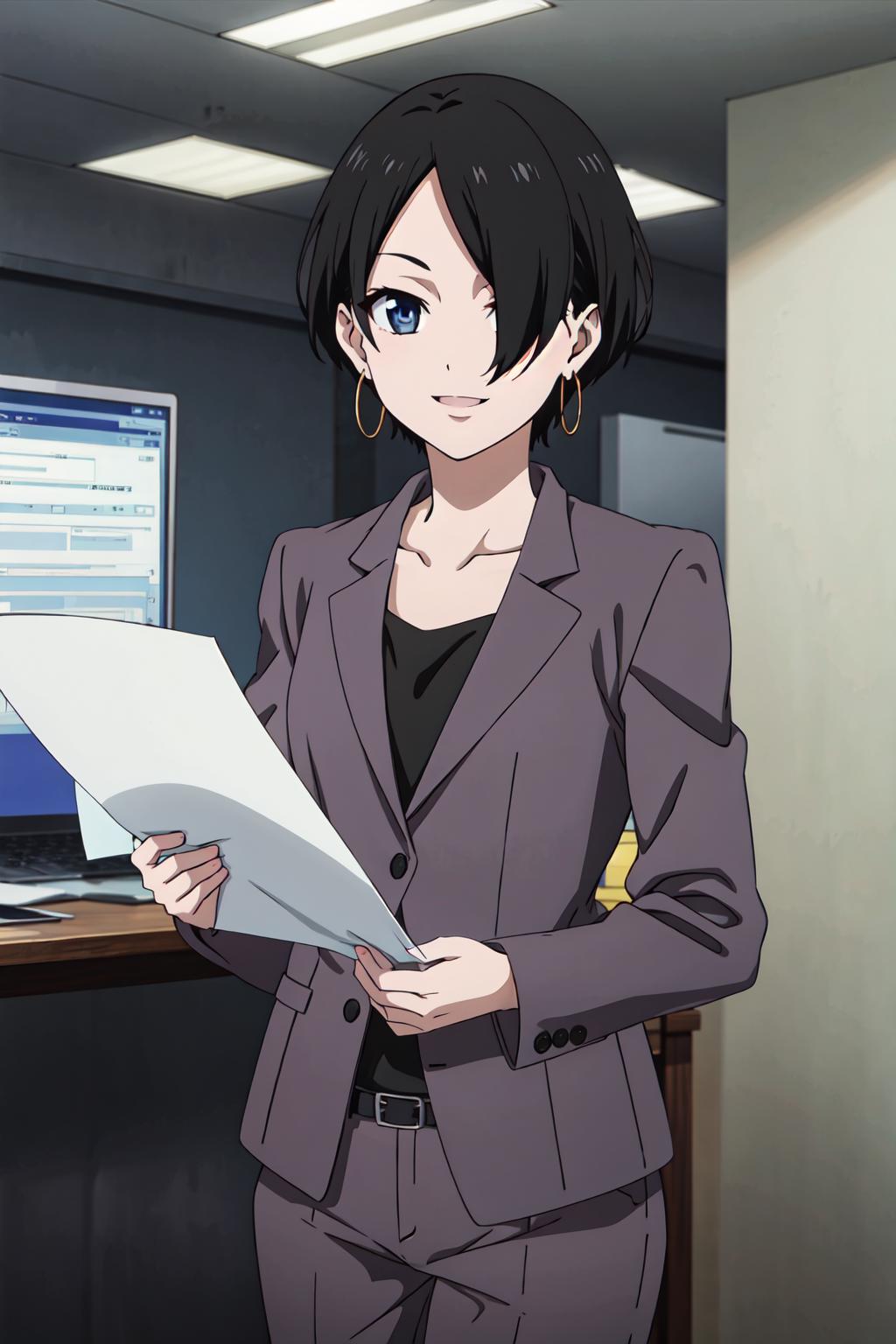 okitsuyuka, hair over one eye, black hair, short hair, blue eyes, earringsClothes / 服 / 衣服: