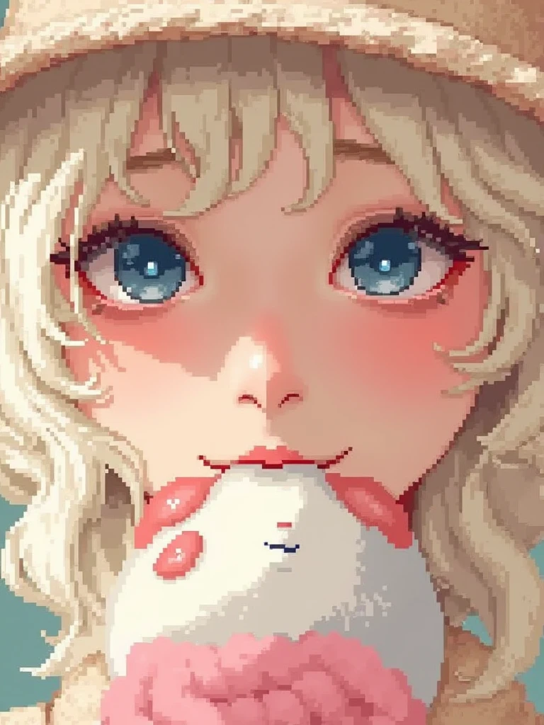 (The image you want) featuring a close-up of a young Asian woman with light skin and striking blue eyes, framed by soft, curly, platinum blonde hair. delicate, cream-colored lace hat with a wide brim, which adds a vintage, whimsical touch to her appearance. She has a small, round pink plush toy in her She has a small, round pink plush toy in her mouth, which she is holding close to her face, creating a sense of intimacy and innocence. The plush toy is white with pink details, resembling a bunny or a teddy bear. teddy bear.