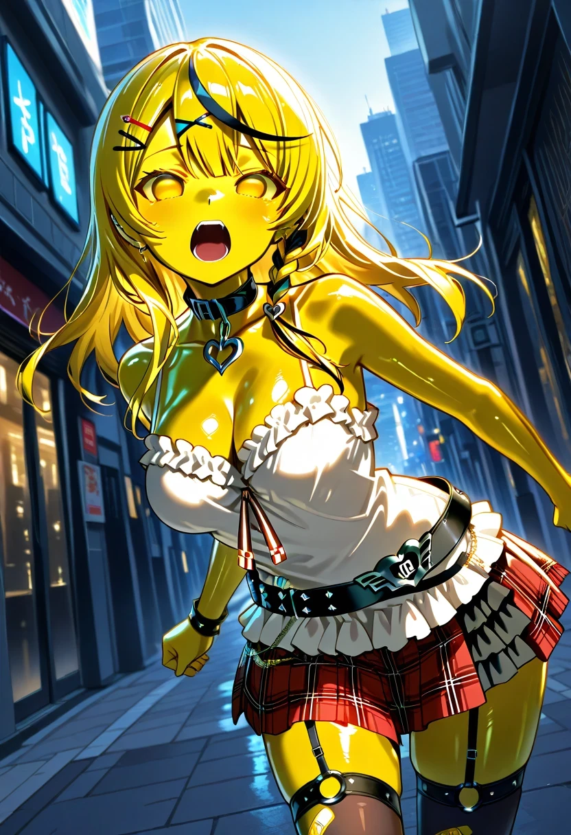 yellow eyes, yellow hair, yellow eyes, yellow hair, yellow sclera, no pupils, yellow skin, shiny skin, metal skin, If the skin of your characters appears grey, remove metal skin.