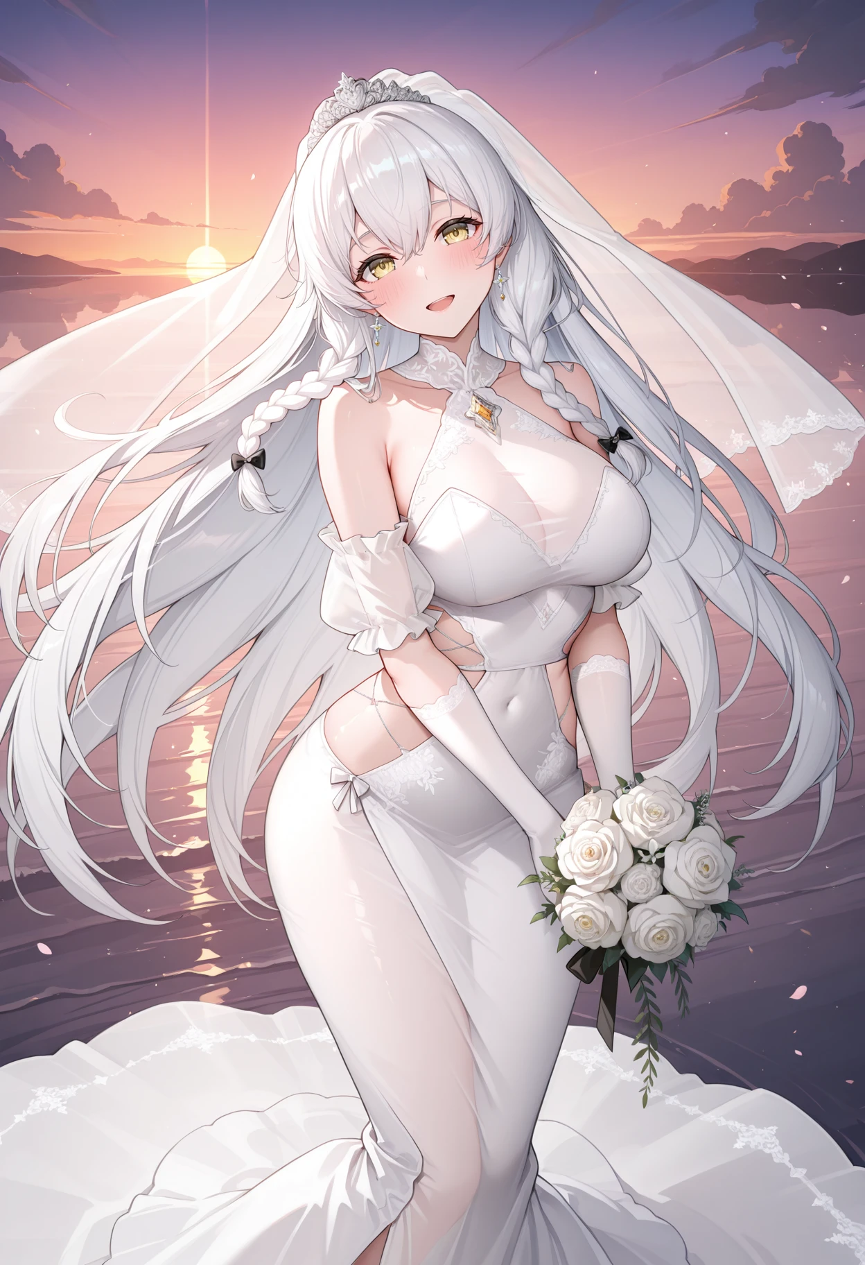 ahrmoath, veil, tiara, black bow, earrings, jewelry, brooch, wed twin braids, wedding dress, white dress, side cutout, detached sleeves, see-through clothes, elbow gloves, white gloves, long dress,