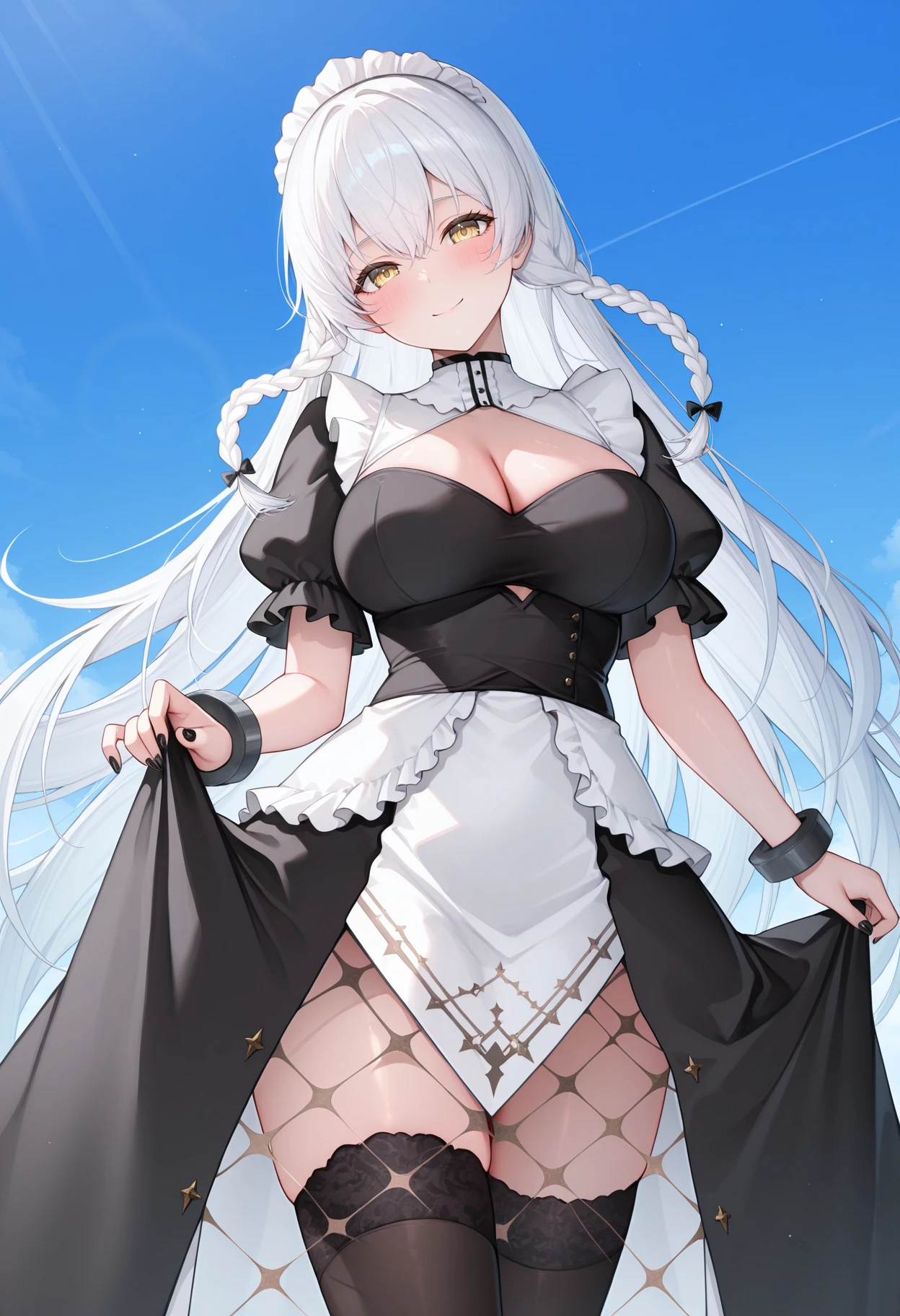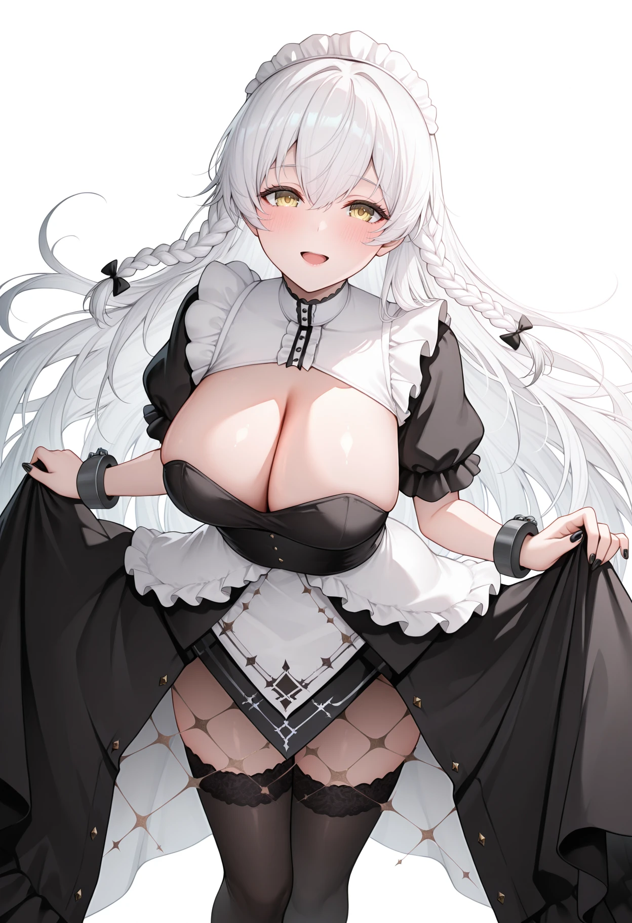 ahrmdef, def twin braids, maid, maid headdress, black dress, puffy short sleeves, cleavage cutout, wrist cuffs, chain, black nails, waist apron, white apron, overskirt, lace-trimmed legwear, black thighhighs, mesh,