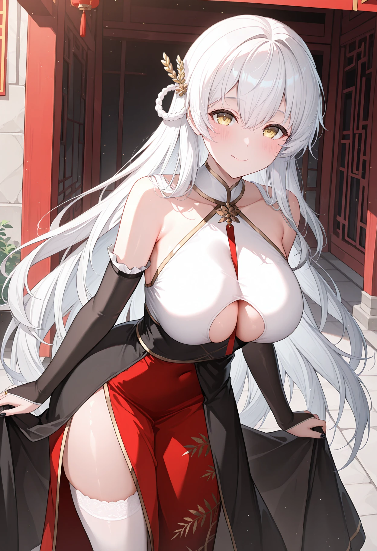 ahrmprh, braided hair rings, china dress, sleeveless dress, halter dress, gold trim, bare shoulders, white shirt, multicolored dress, red skirt, skirt under dress, overskirt, black dress, cleavage cutout, red necktie, detached sleeves, elbow gloves, black sleeves, bridal gauntlets, black nails, side slit, pelvic curtain, white thighhighs,