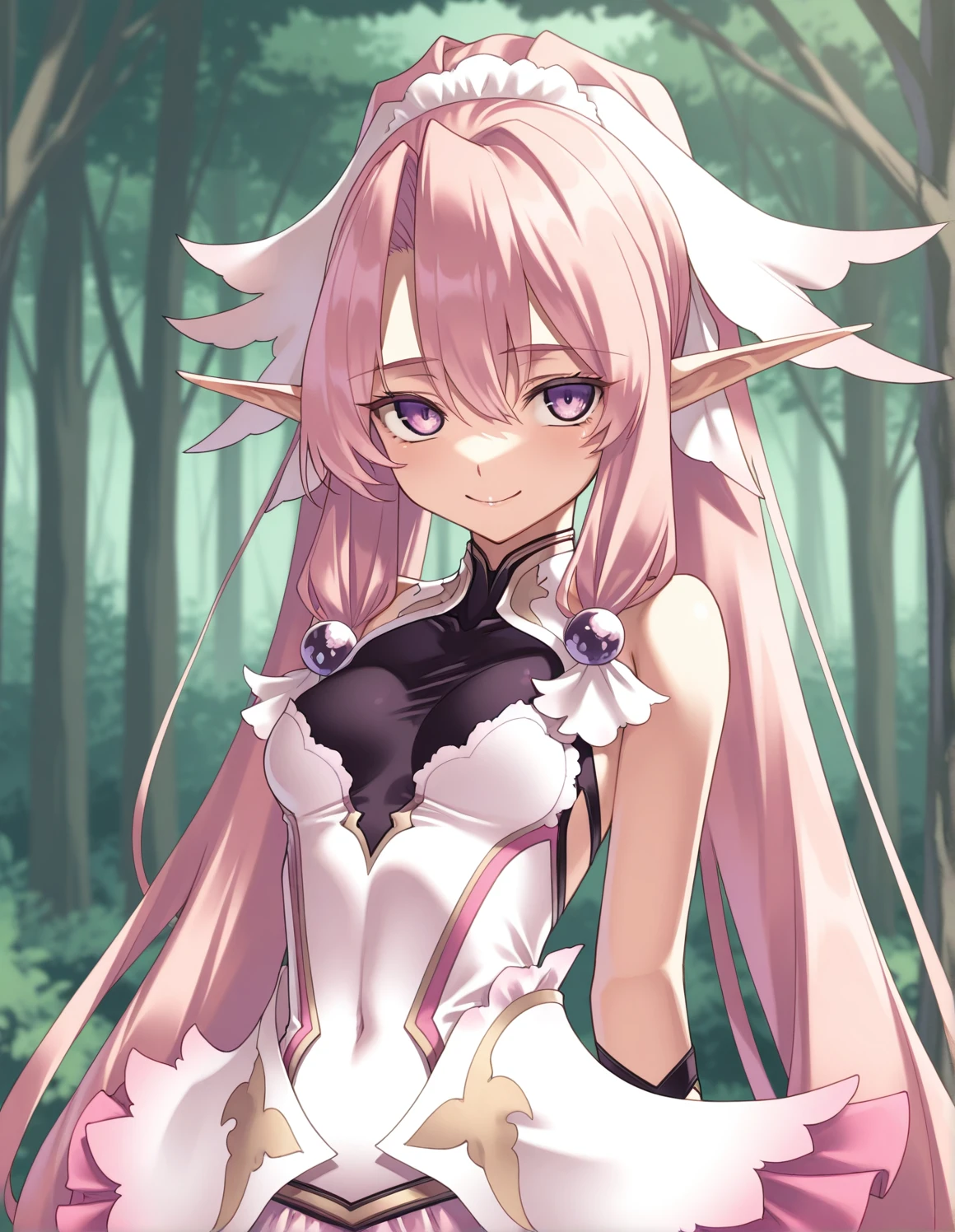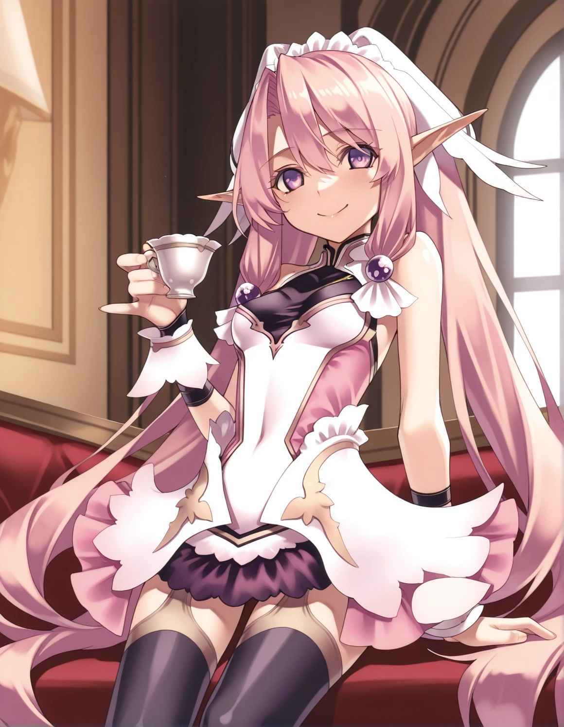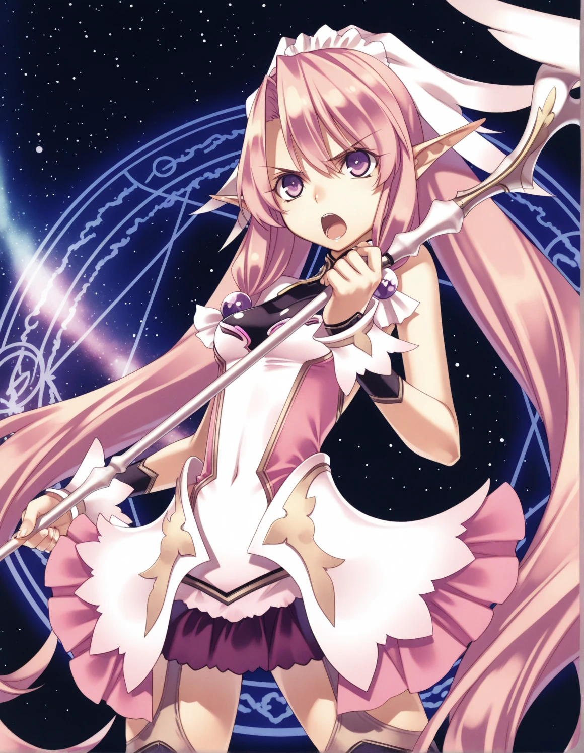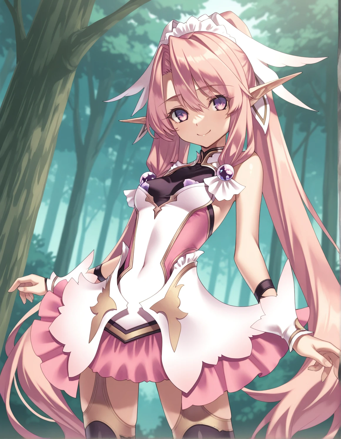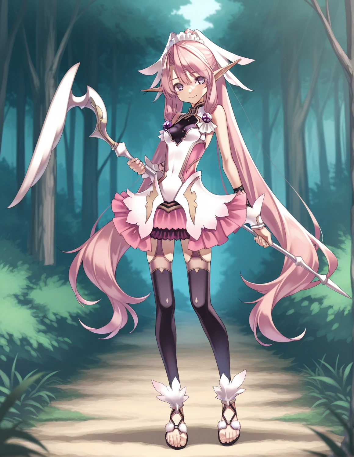 1girl, ellis, pink hair, purple eyes, twintail, headdress, hair_ornament, very_long_hair, pointy_ears, wrist_cuffs, skirt, thighhighs, sandals,