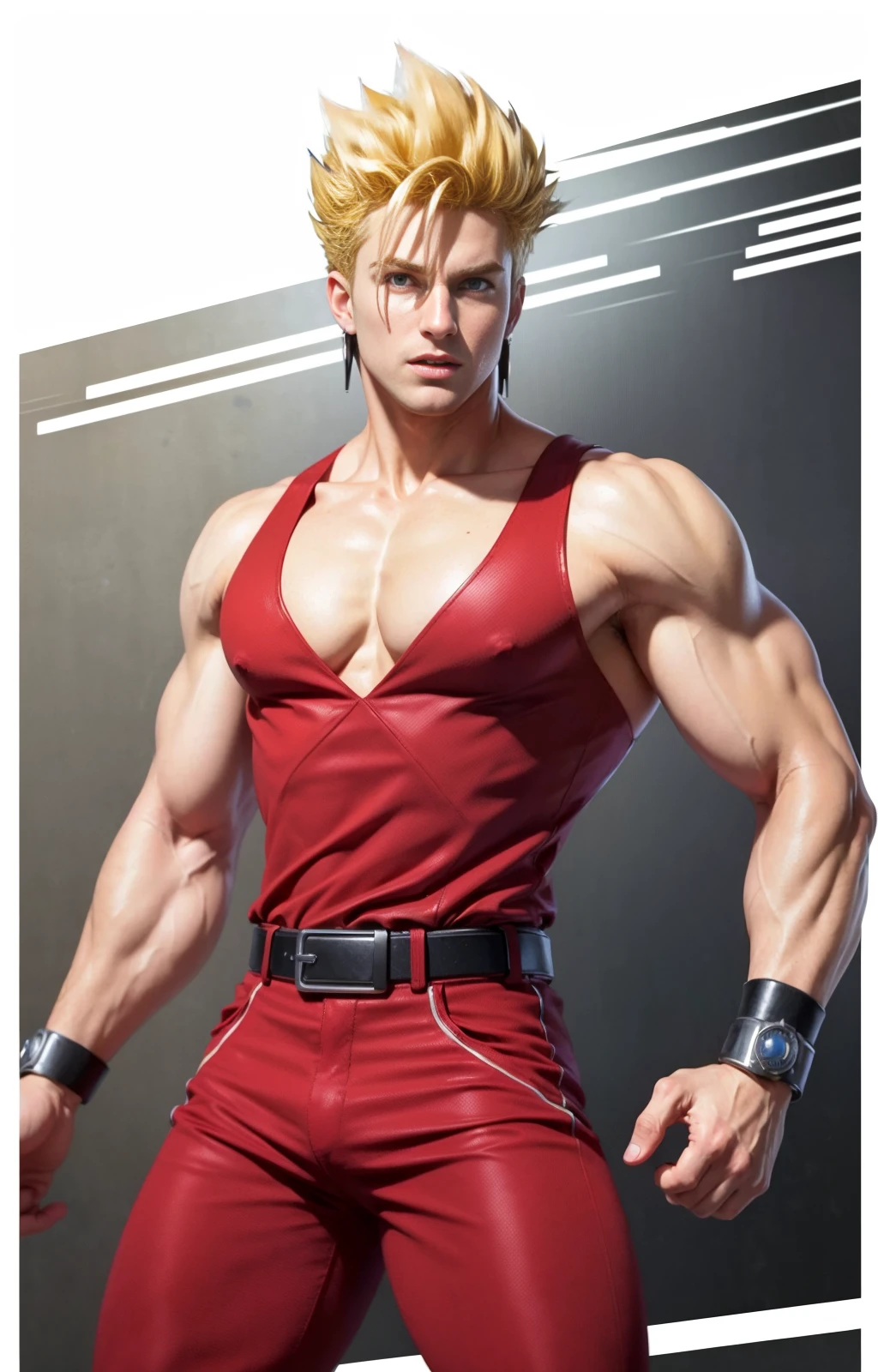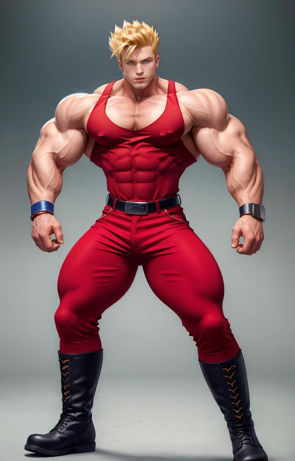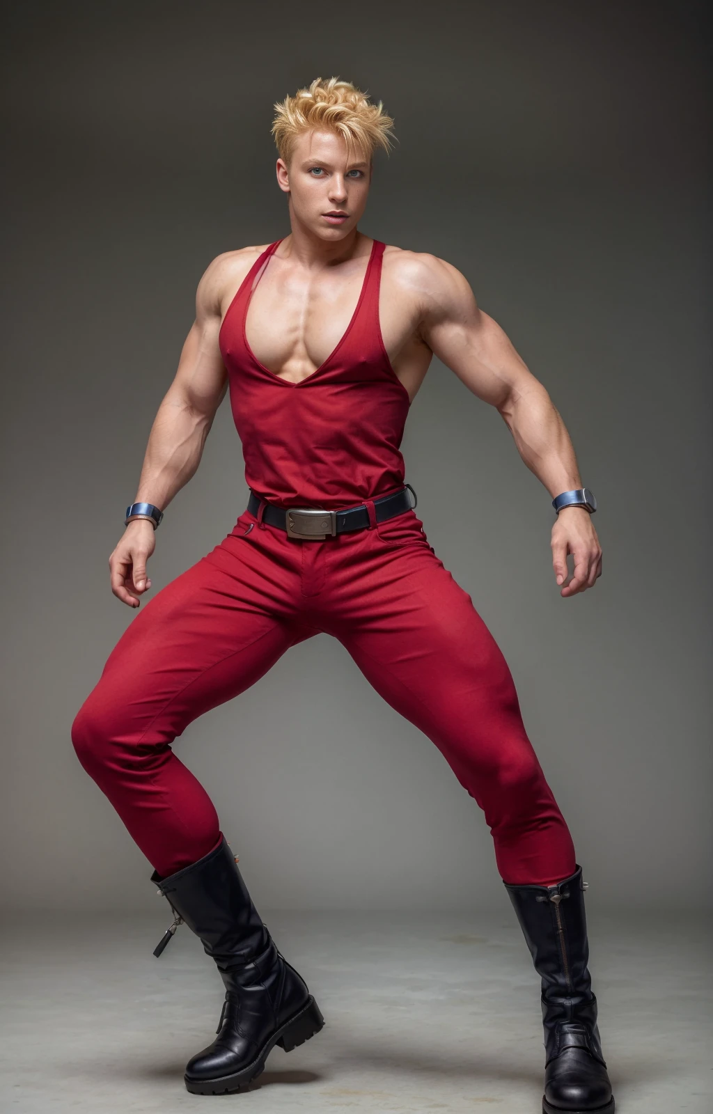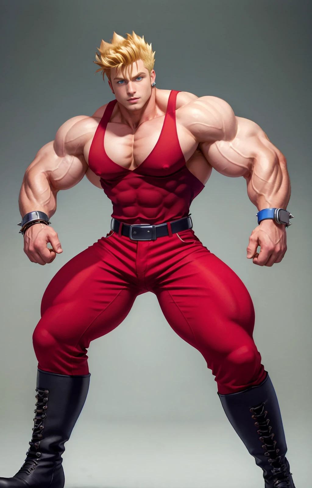 jackyb, 1boy, solo, male focus, blonde hair, spiked hair, uncomb hair, silver wristbands, belt, black boots, fringe, blue eyes, (red top tank,) red fitted sleeveless shirt, red fitted pants,