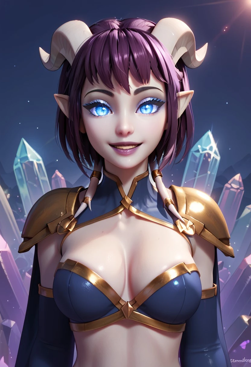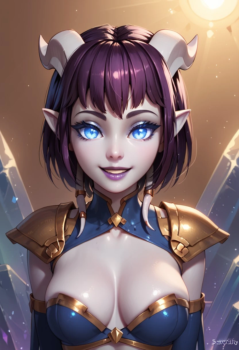 Features: 1girl,draenei,perfect eyes,no sclera,blue eyes,glowing eyes,short hair, pointy ears,((white skin,pale skin,colored skin)),dark purple hair,pale skin,fringe,bangs,horns,hooves,tail,