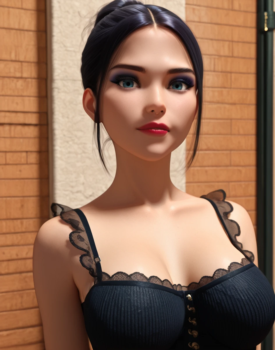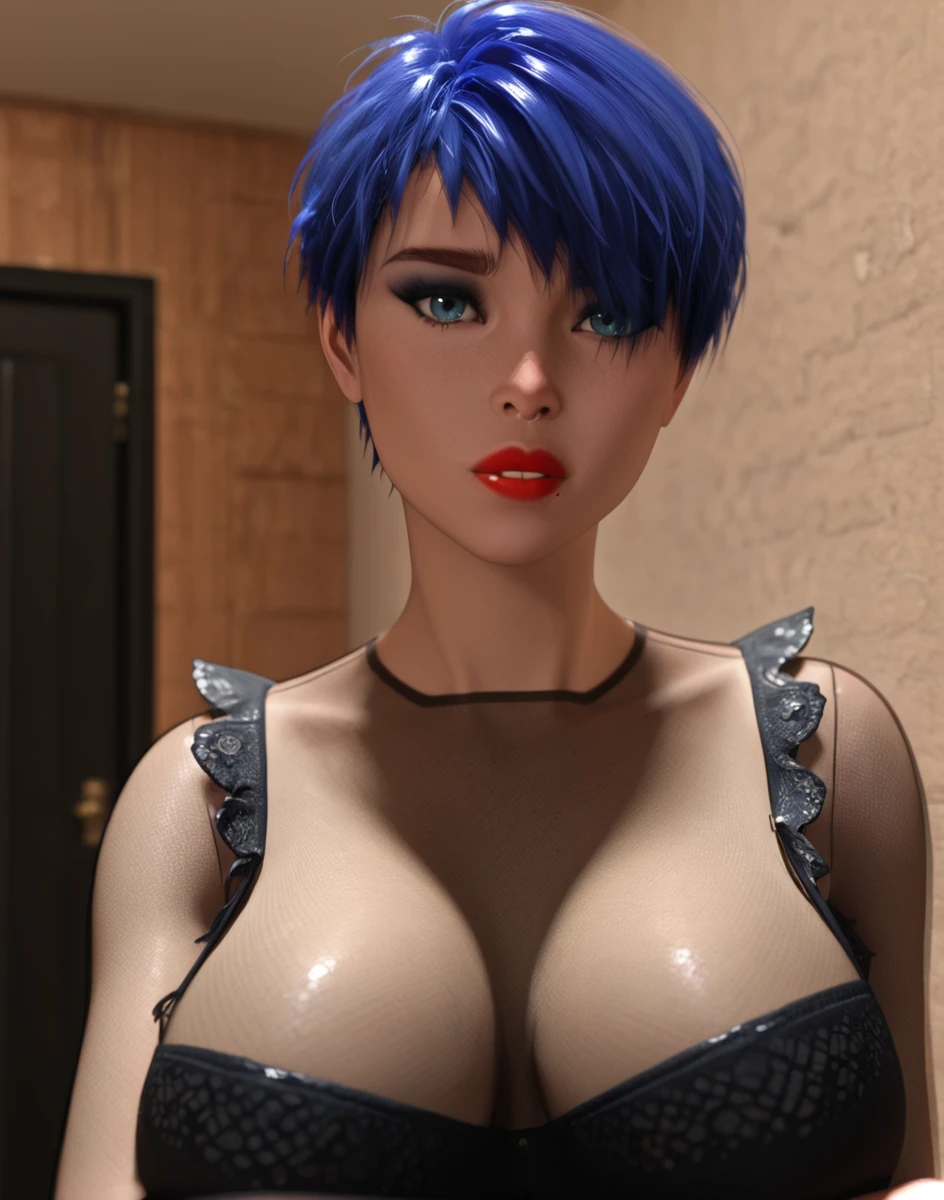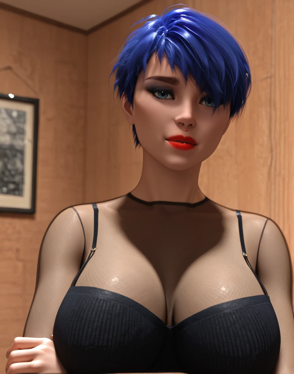 roxane, short hair, black hair,blue eyes, makeup,ponytail,small breasts,