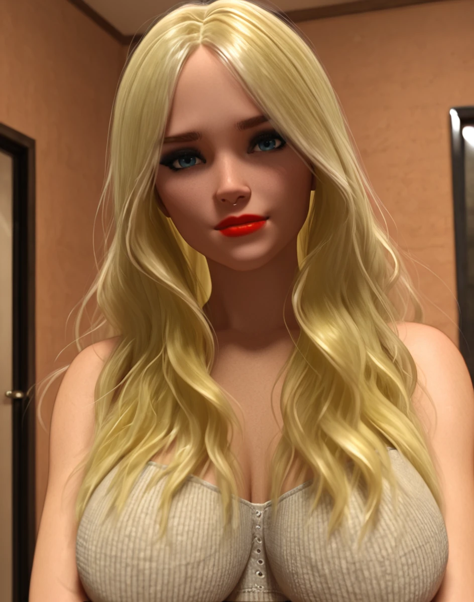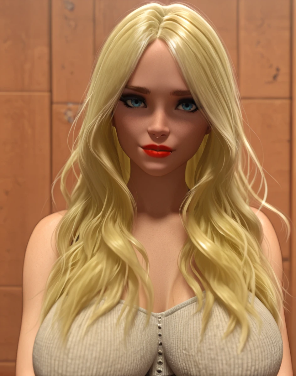 p4uline, 1girl, long hair, blonde hair, red lipstick,blue eyes, makeup, medium breasts,