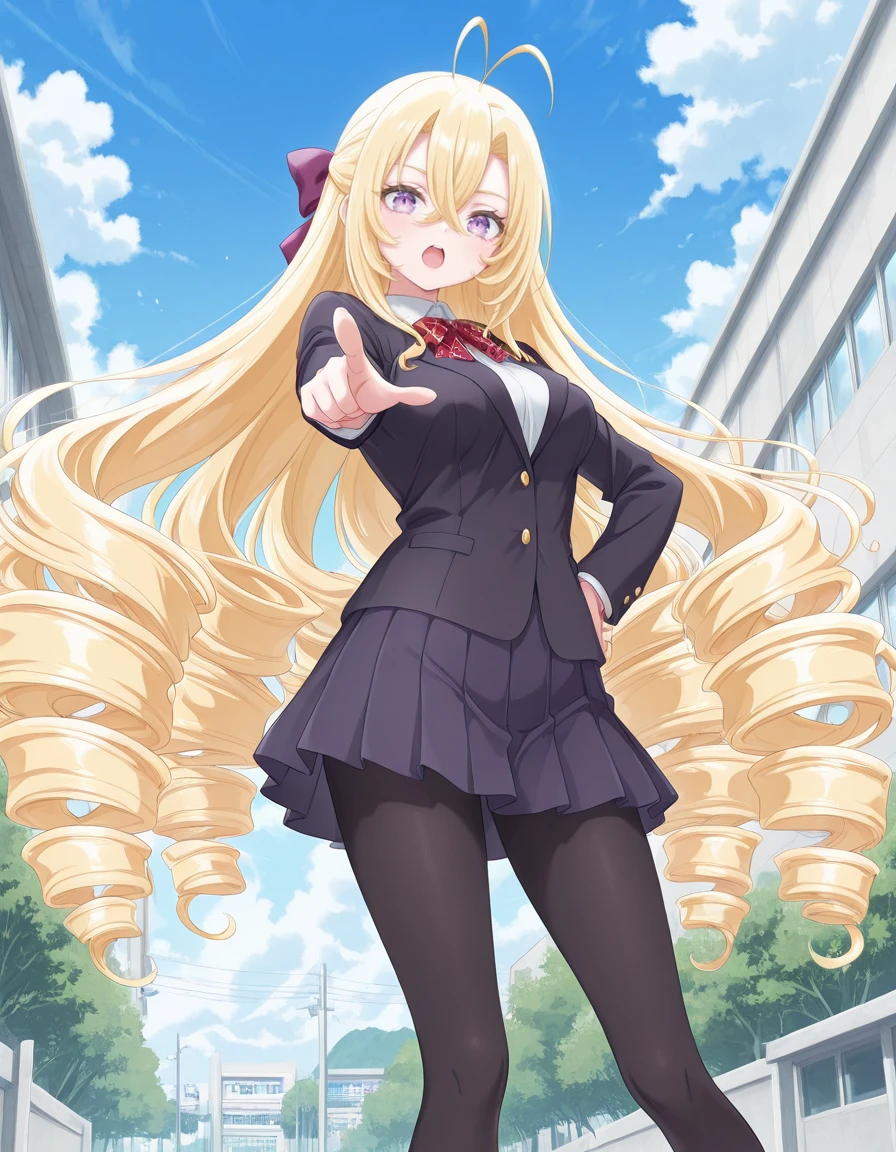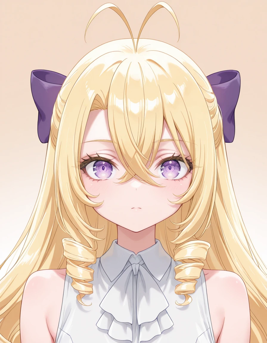 <lora:mishiro-shiboyugi_s1-ixl-anime-soralz:1>, mishiro (shiboyugi), very long hair, blonde hair, low drills, drill sidelocks, antenna hair, hair between eyes, purple eyes, purple hair bow