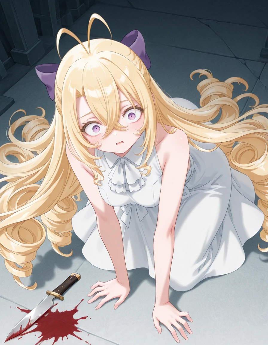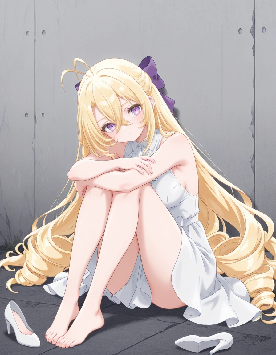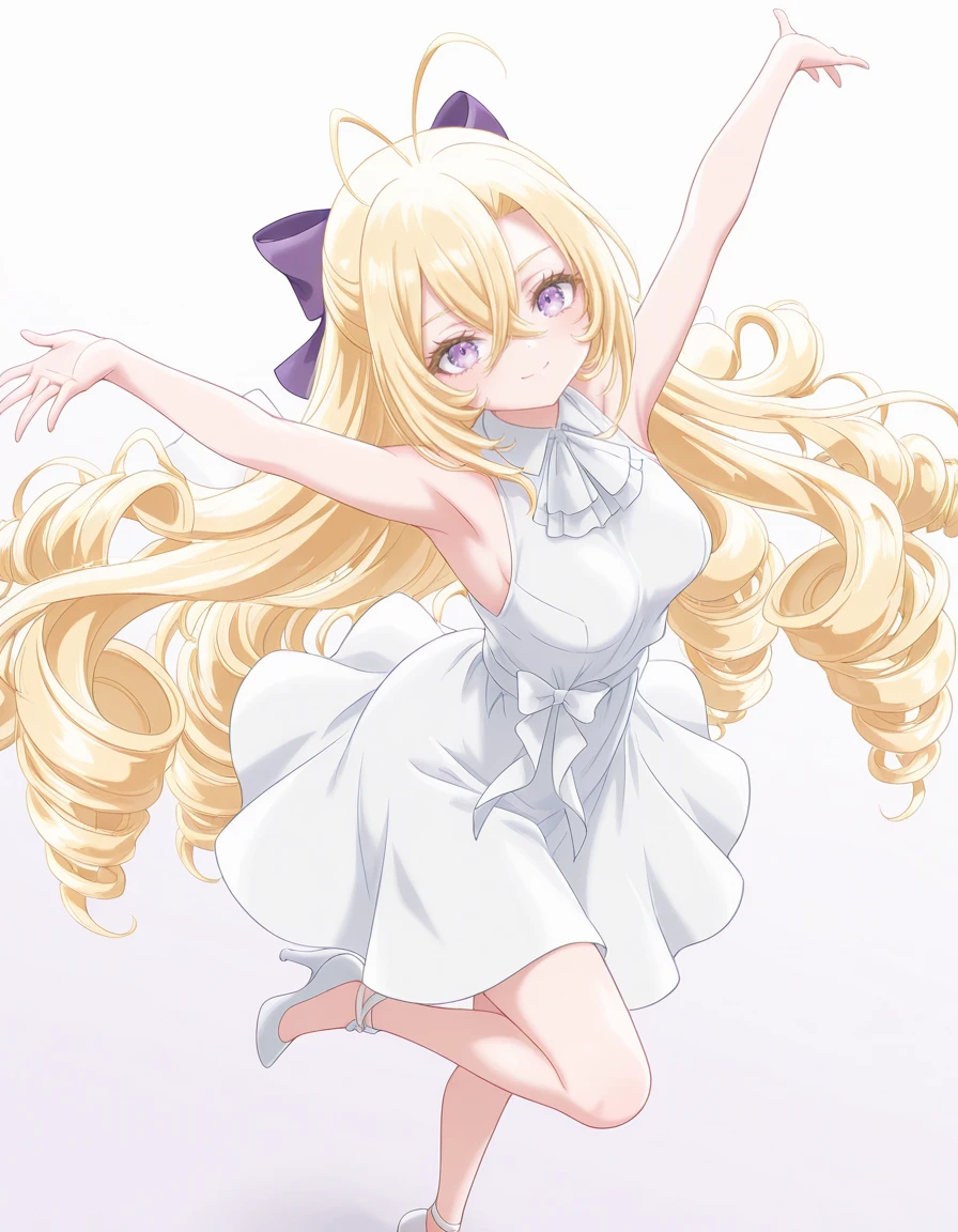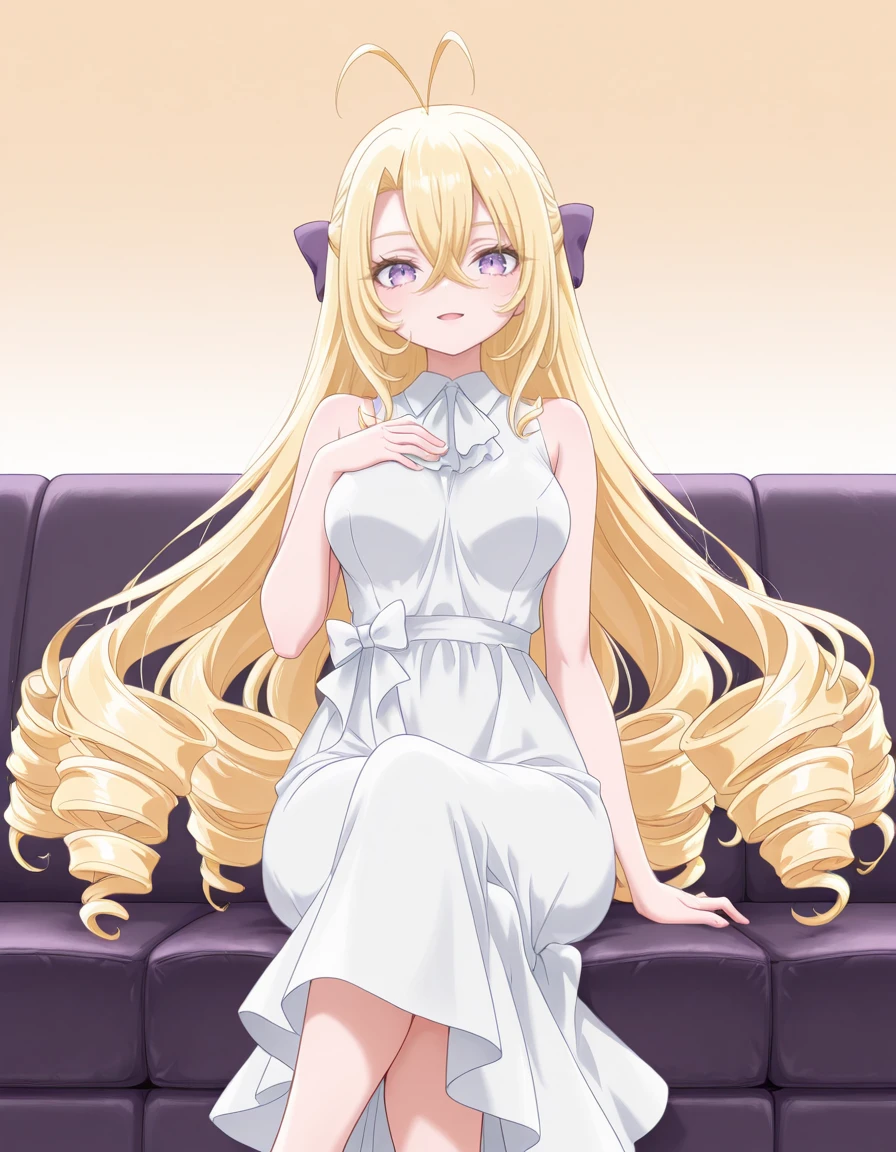 <lora:mishiro-shiboyugi_s1-ixl-anime-soralz:1>, mishiro (shiboyugi), very long hair, blonde hair, low drills, drill sidelocks, antenna hair, hair between eyes, purple eyes, purple hair bowOutfit - White Dress (Scrap Building)