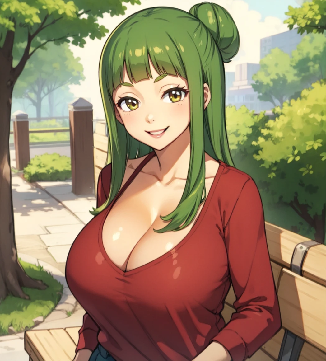 ezkleene,green hair,long hair,single hairbun,maturefemale,solo,big breasts