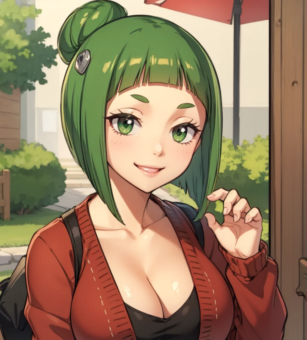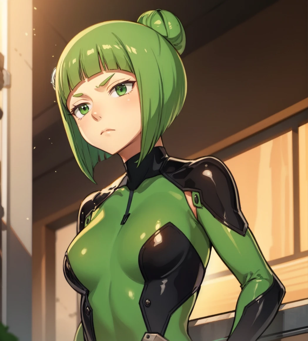 ezkleene,green hair,short hair,single hairbun,maturefemale,solo