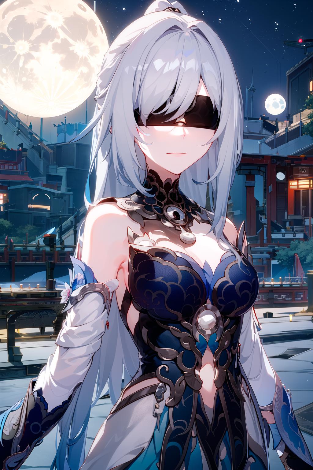 可能会用到的提示词:jingliu,1girl,solo,(blindfold )(full body )(from behind )(standing )(from side )(cowboy shot )(close-up )(outdoors )(upper body )(looking at viewer )