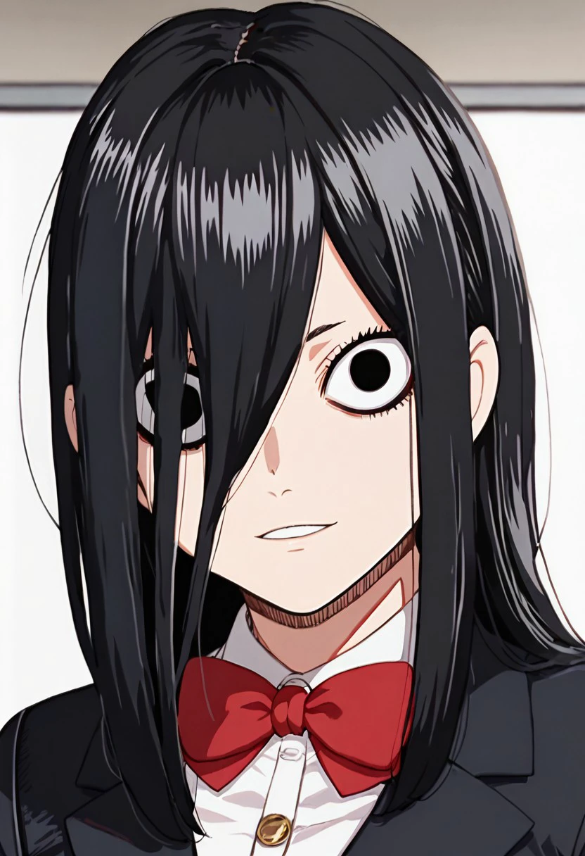 yukishiro, long hair, black hair, bangs, hair between eyes, black eyes, hair over one eye, parted lips, breasts, large breasts