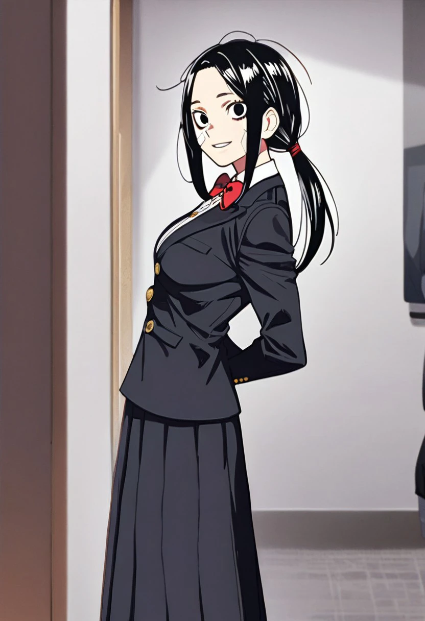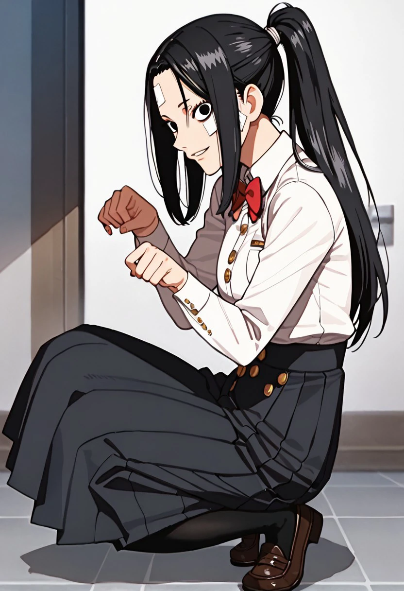 shirt, white shirt, collared shirt, blazer top, navy blazer, buttons, bow tie, red bow tie, skirt, long skirt, tights, black tights, loafers,