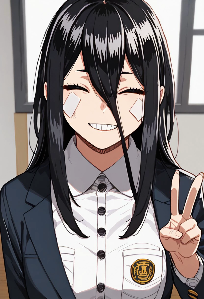 yukishiro, long hair, black hair, black eyes, bandaid, ponytail, low ponytail, forehead, parted lips, breasts, medium breasts
