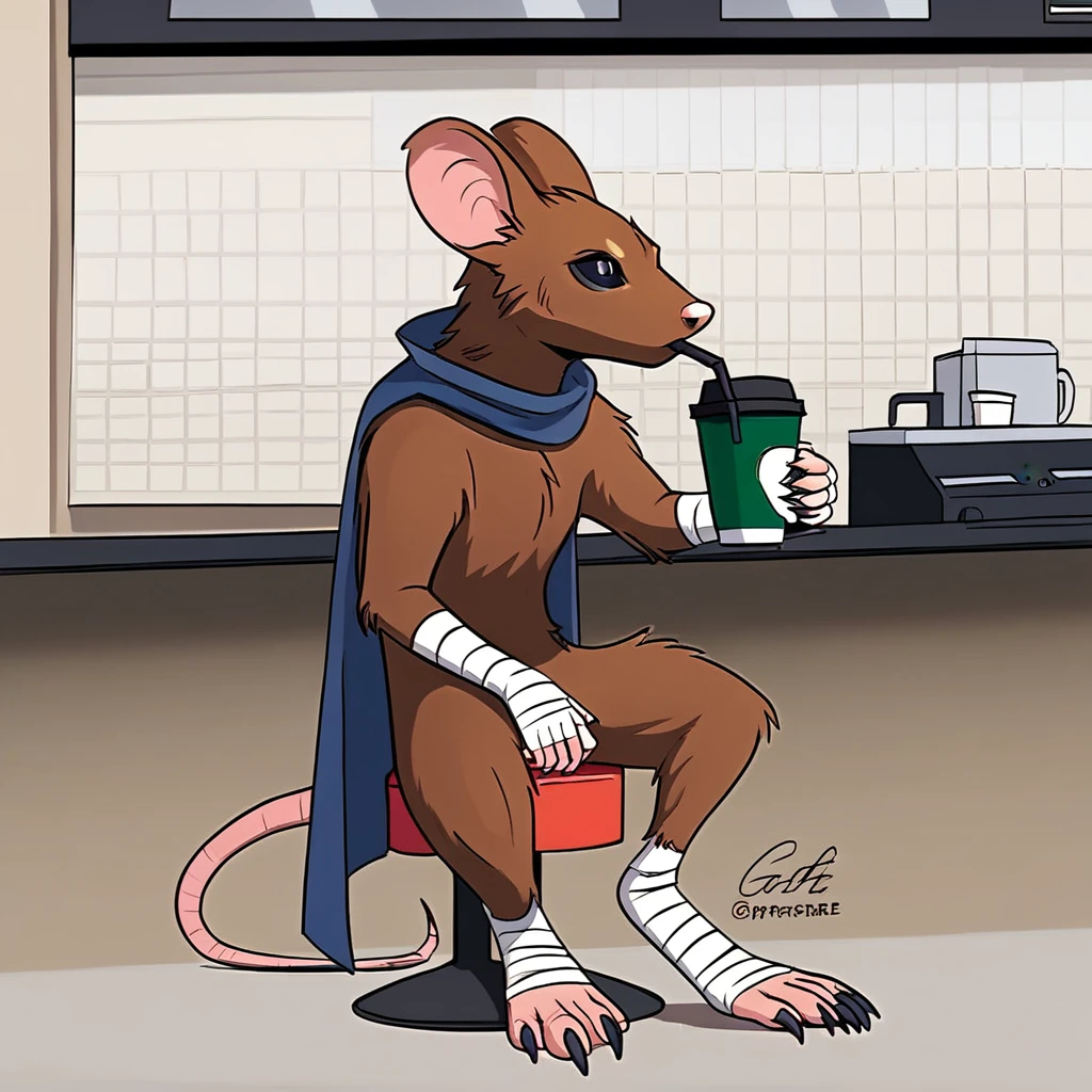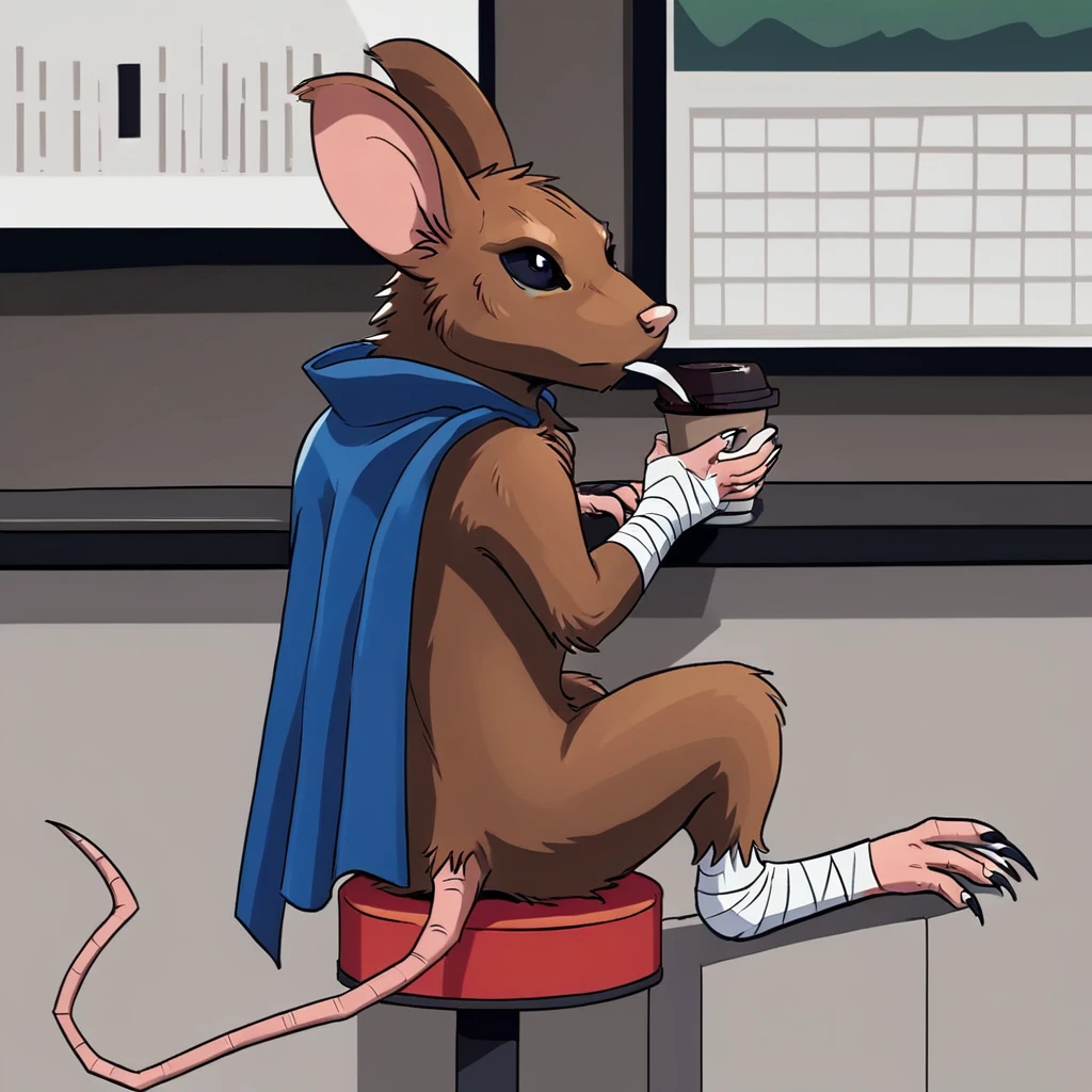 feral, male, mouse, brown fur, animal ears, blue cape, black eyes, black sclera, metal tail
