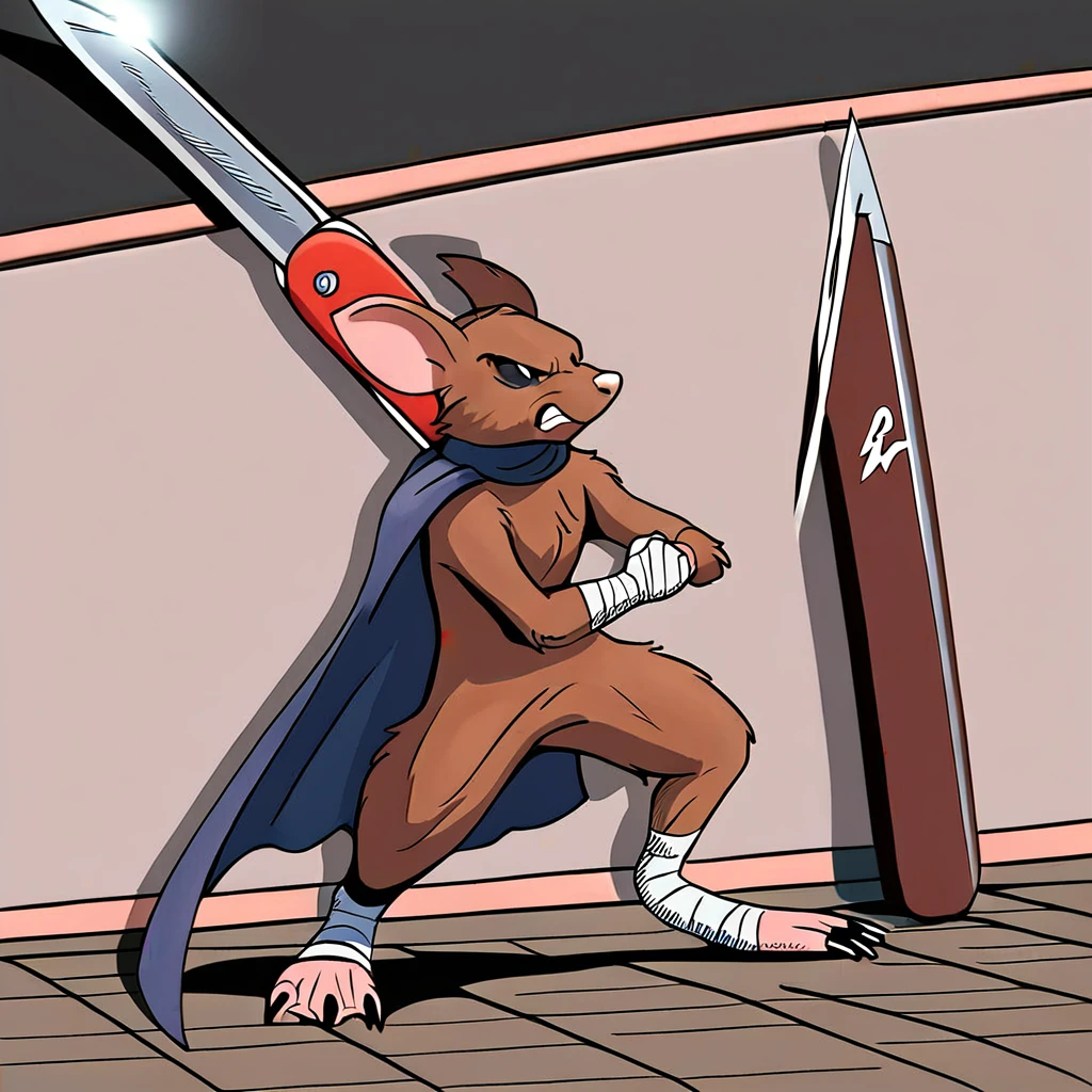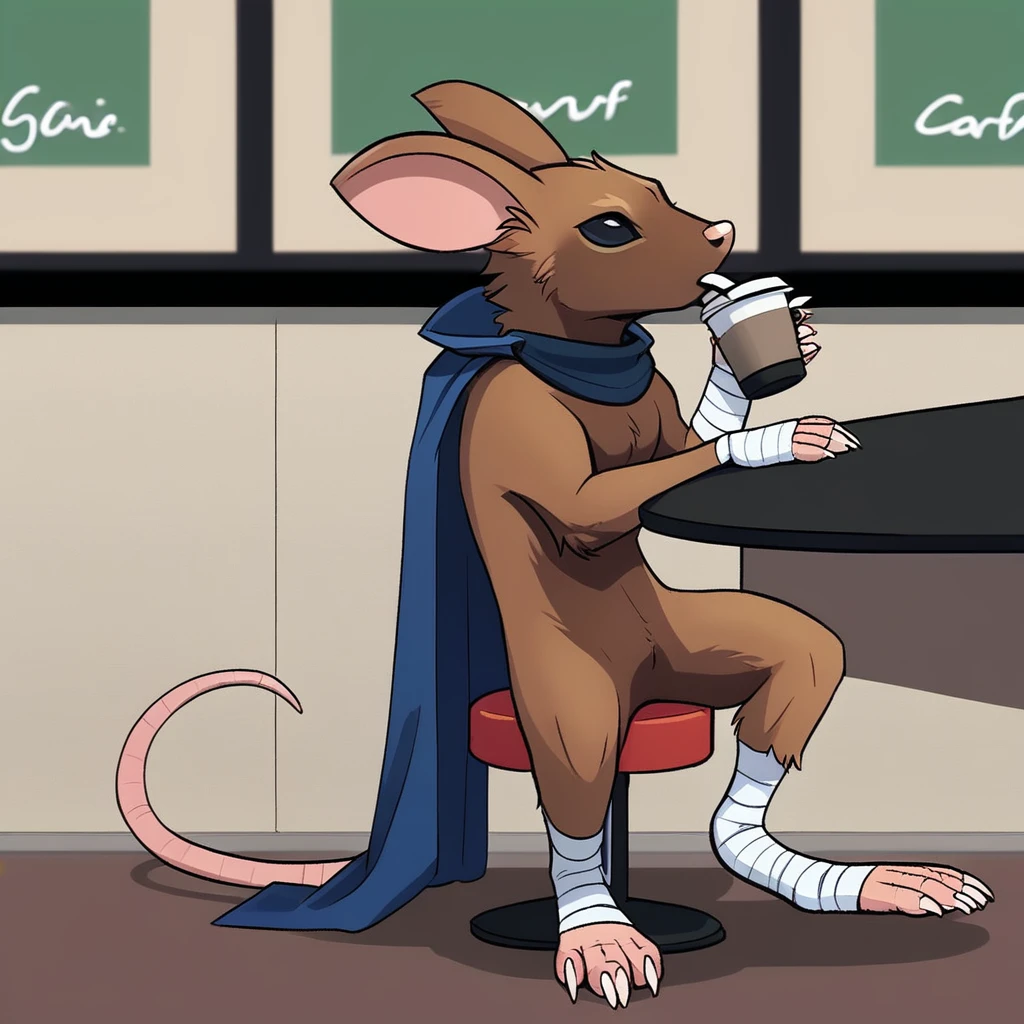 feral, male, mouse, brown fur, metal tail, animal ears, blue cloak, hand wraps, leg wraps, black eyes, black sclera