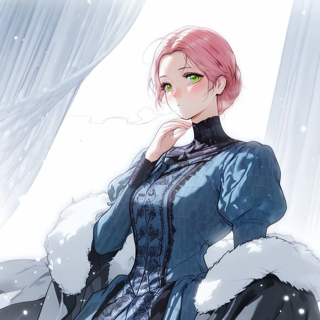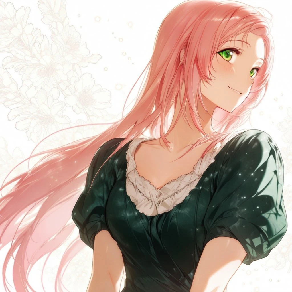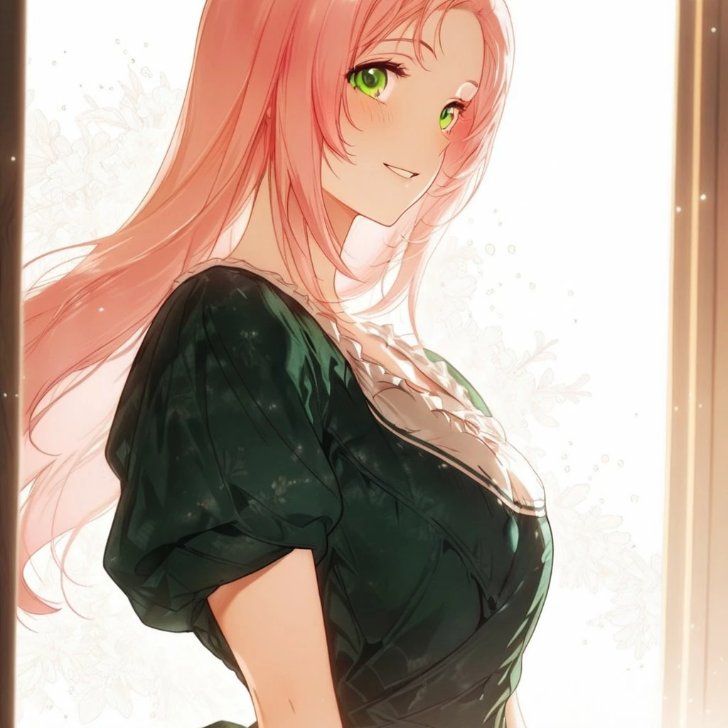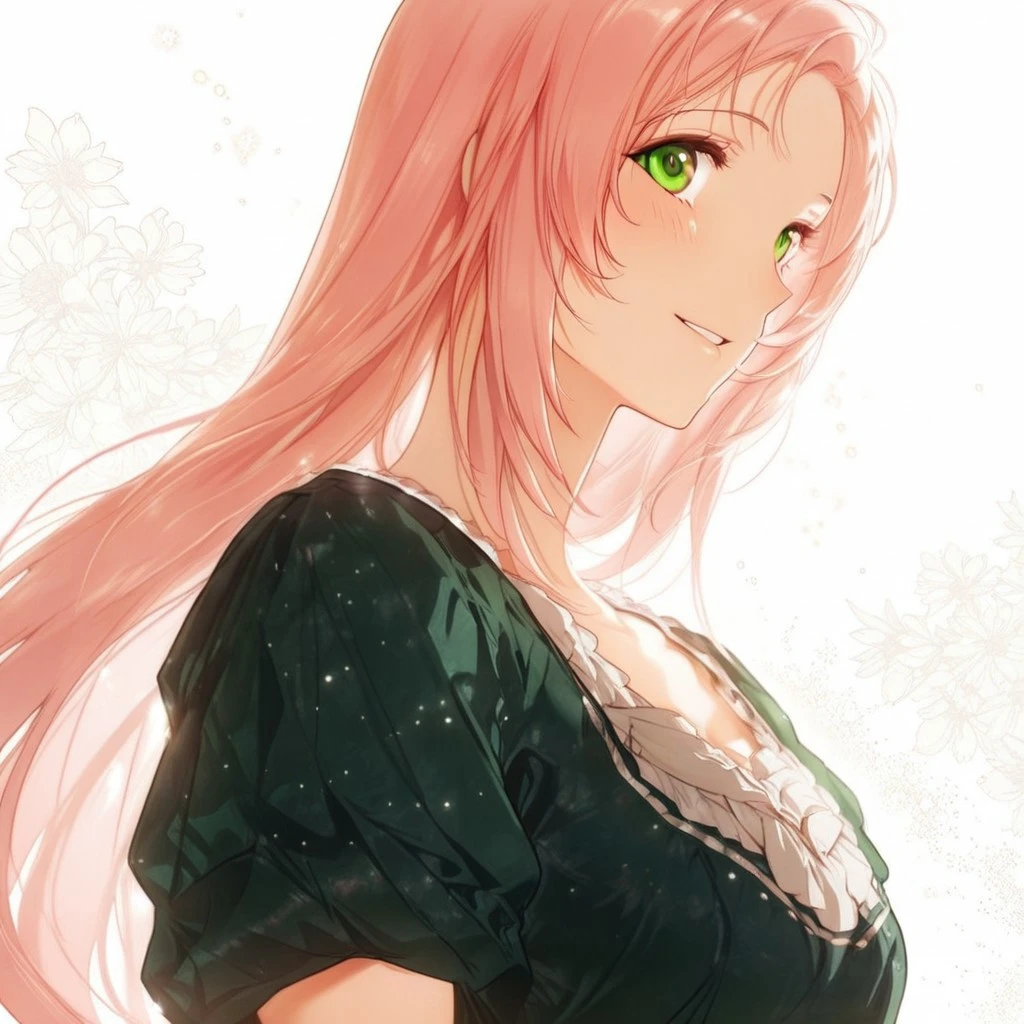 pink hair, green eyes, long hair, slender body