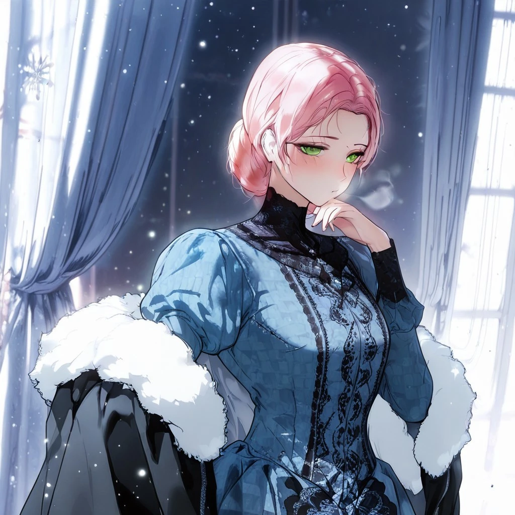 shurioutfit2, blue dress, puffy sleeves, cloak, fur trim, hairbun, curtain bangs