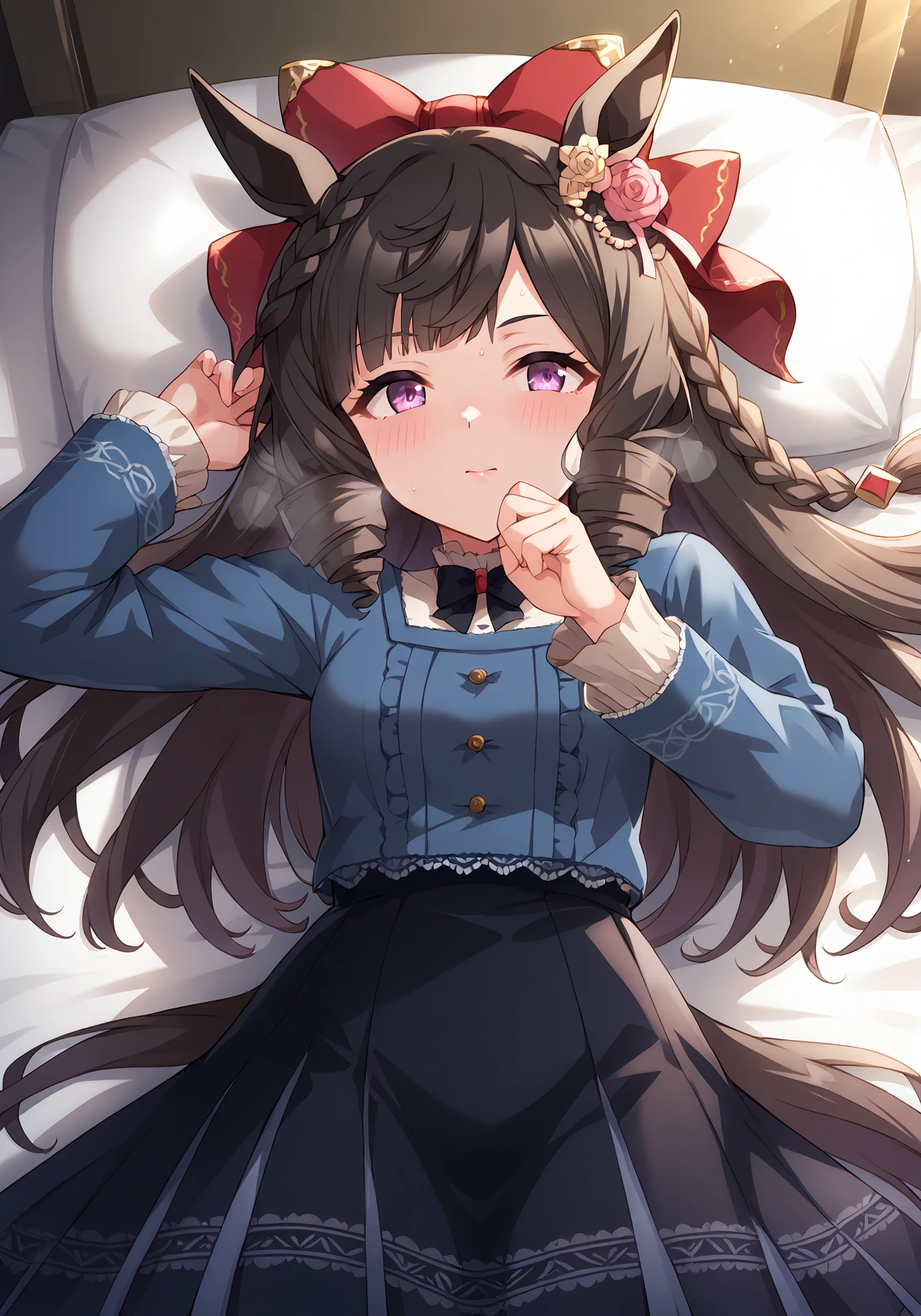 1girl,black hair,drill hair,crown braid,bangs,horse girl,long hair,purple eyes